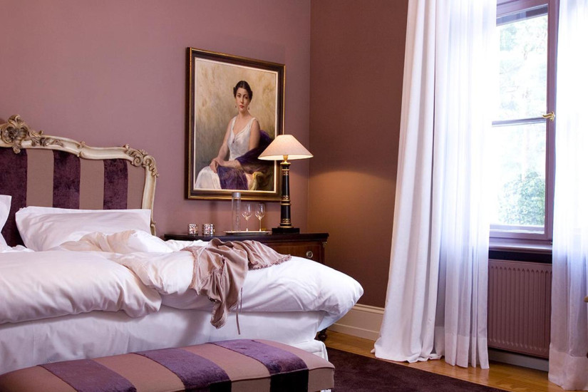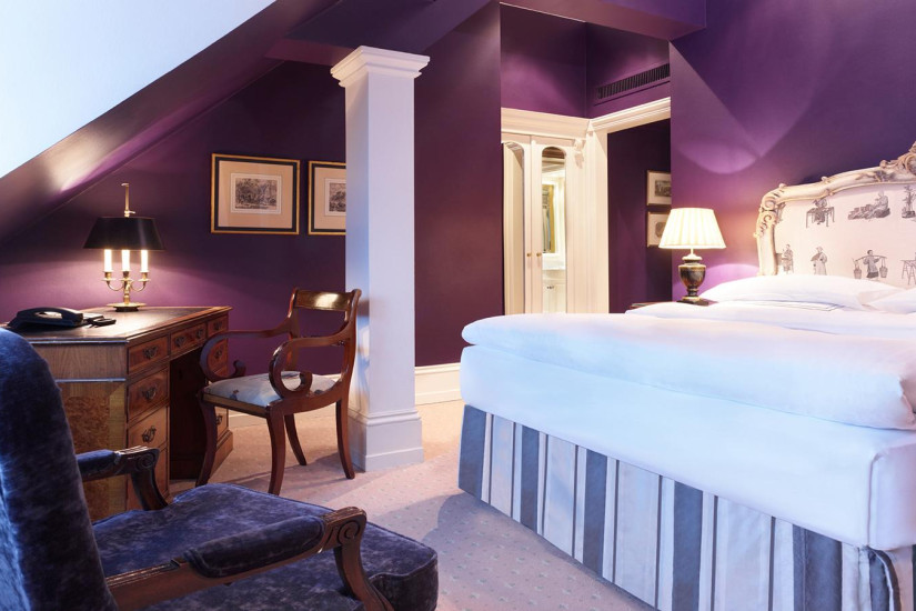 - 33-38 м2. Уникальный номер в черно-белых и пурпурных тонах, дизайн для которого разрабатывал Патрик Хеллманн. Роскошные ткани, мастерски вышитые детали, индивидуально разработанный дизайн кресел, шкафов, рабочего стола и штор. Состоит из прихожей, спальни с кроватью king-size и ванной комнаты с ванной и отдельным душем. Вид на внутренний дворик. Максимальное размещение - 2 взрослых. Дополнительные кровати не предоставляются.