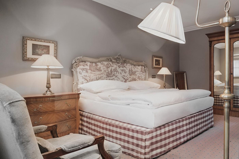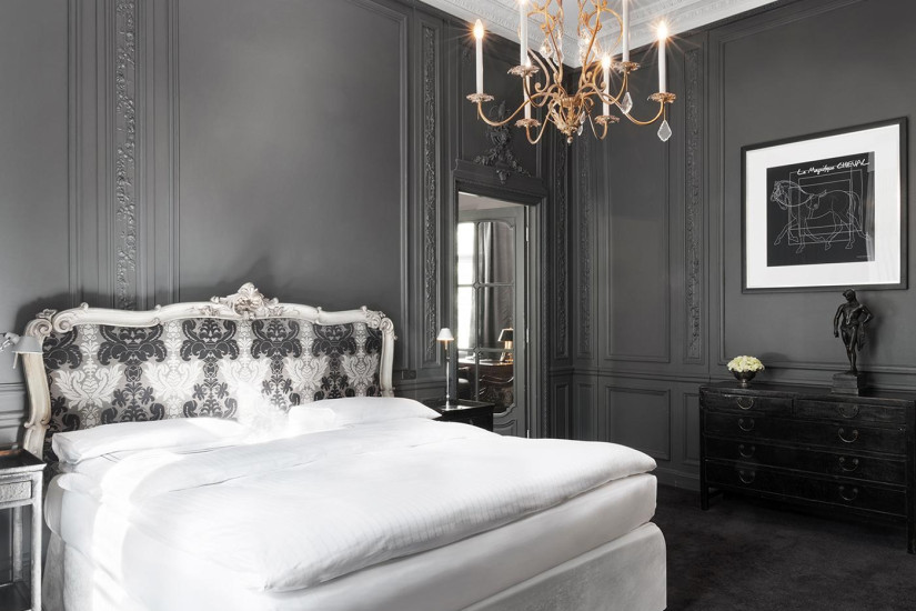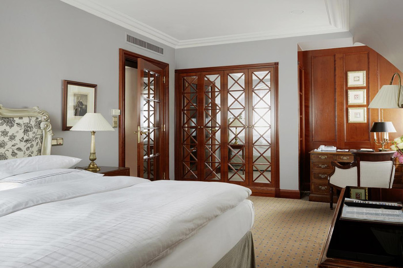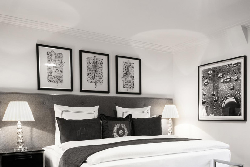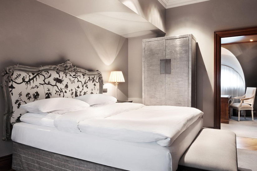 - 35-38 м2. Роскошный номер в черно-белых и золотисты тонах, дизайн для которого разрабатывал Патрик Хеллманн. Роскошные ткани, мастерски вышитые детали, индивидуально разработанный дизайн кресел, шкафов, рабочего стола и штор. Состоит из прихожей, спальни с кроватью king-size, просторной ванной комнаты с ванной и отдельным душем. Вид на внутренний дворик. Максимальное размещение - 2 взрослых. Дополнительные кровати не предоставляются.