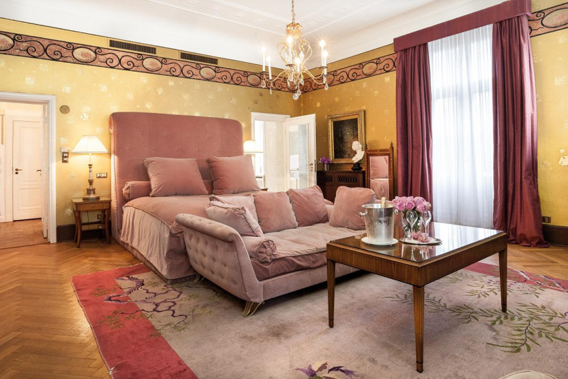- 200 м2. Роскошный номер, украшенный антикварными предметами и произведениями искусства, включает прихожую, две спальни с ванными комнатами и отдельными туалетными комнатами, гостиную, столовую на 6 персон, библиотеку, декорированную старинными фресками и мебелью 1912 г., гостевую уборную.