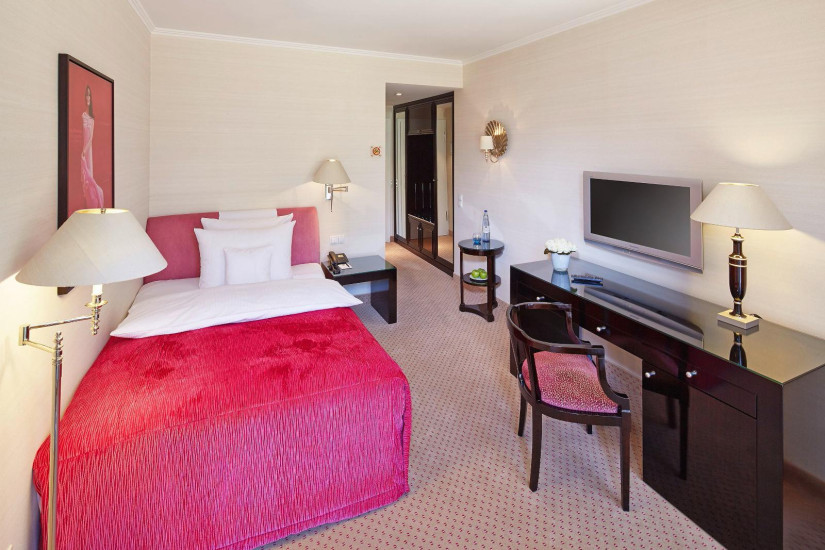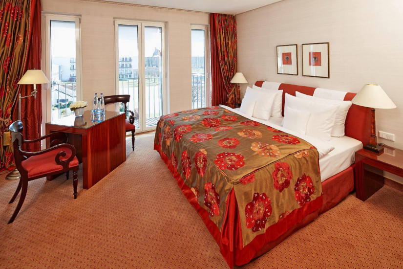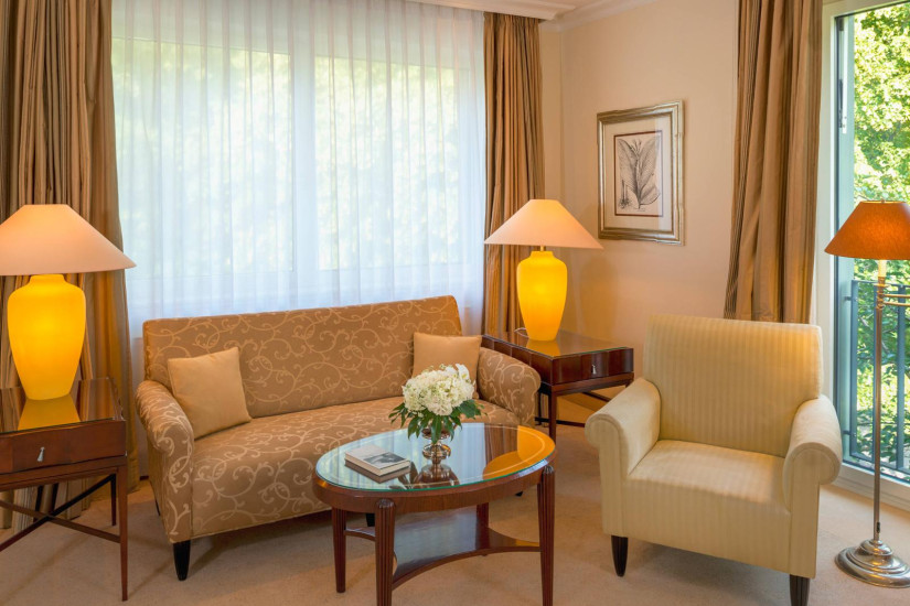 - 33 м2. Состоит из спальни с двуспальной кроватью или двумя кроватями twin, зоны отдыха, ванной комнаты с ванной и душем, балкона с вид на парк Bürgerpark. Каждый номер данной категории отмечен рукой знаменитого дизайнера Графа Пилати: теплые тона бежевых, кремовых и свежих зеленых оттенков идеально дополняют изящные формы меблировки и ниспадающие линии драпировок.