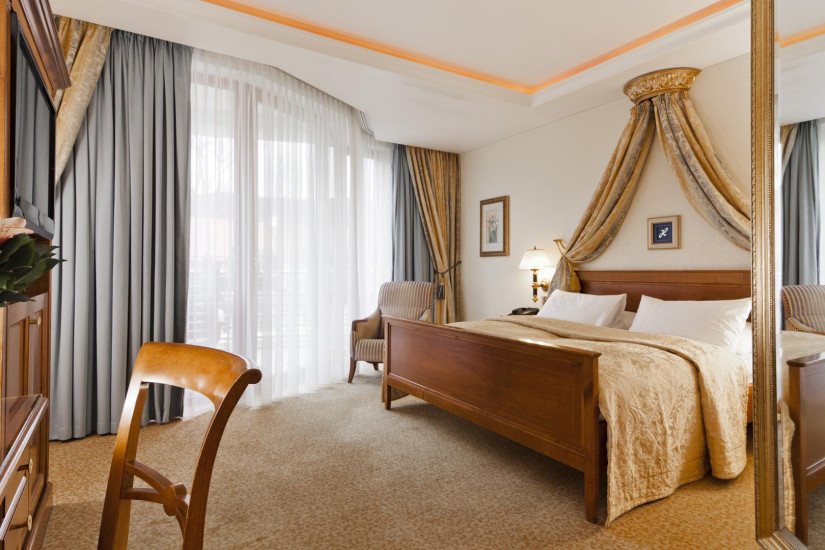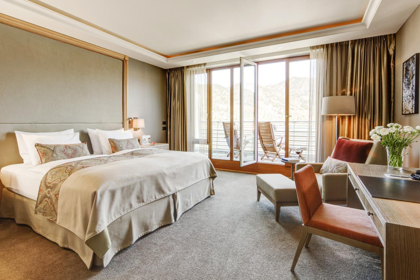 - 50 м2. Просторный, уютный номер с видом на альпийский пейзаж и долину, элегантно обставлен и декорирован в современном стиле. Состоит из спальни с кроватью king-size, гостиной зоны, отделанной мрамором ванной комнаты с ванной и тропическим душем, балкона или террасы. Возможно объединение некоторых номеров с номером категории Superior Room.