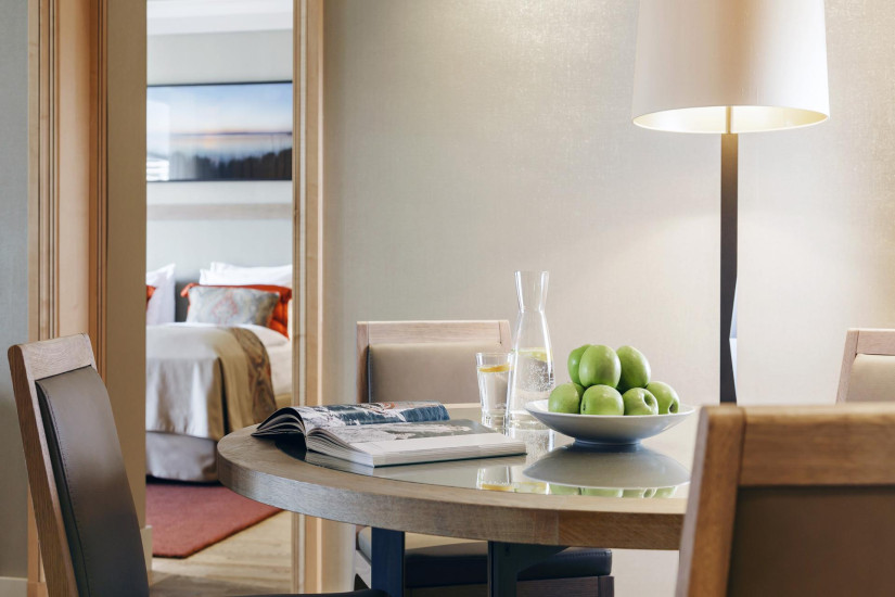 - 80 м2. Просторный двухуровневый номер с потрясающими панорамными видами на горы и озеро оформлен в светлых тонах. Состоит из спальни с кроватью king-size, гостиной со столовой зоной, отделанной мрамором роскошной ванной комнаты, туалетной комнаты для гостей с душем, балкона и просторной террасы или зимнего сада.