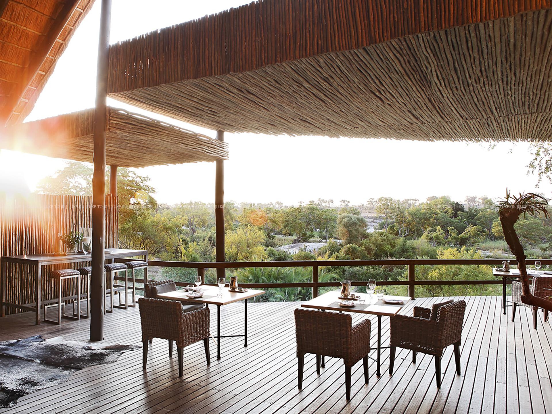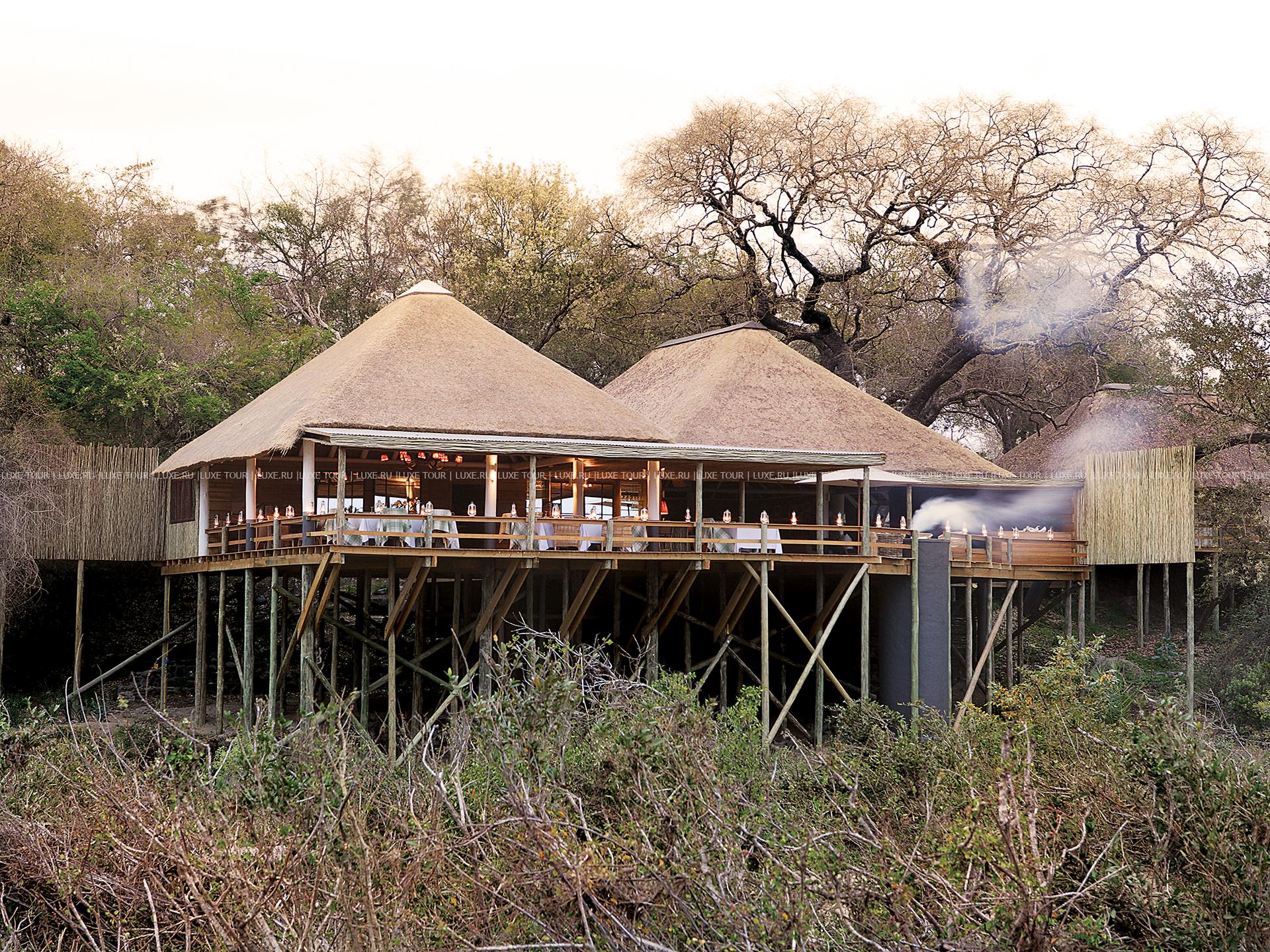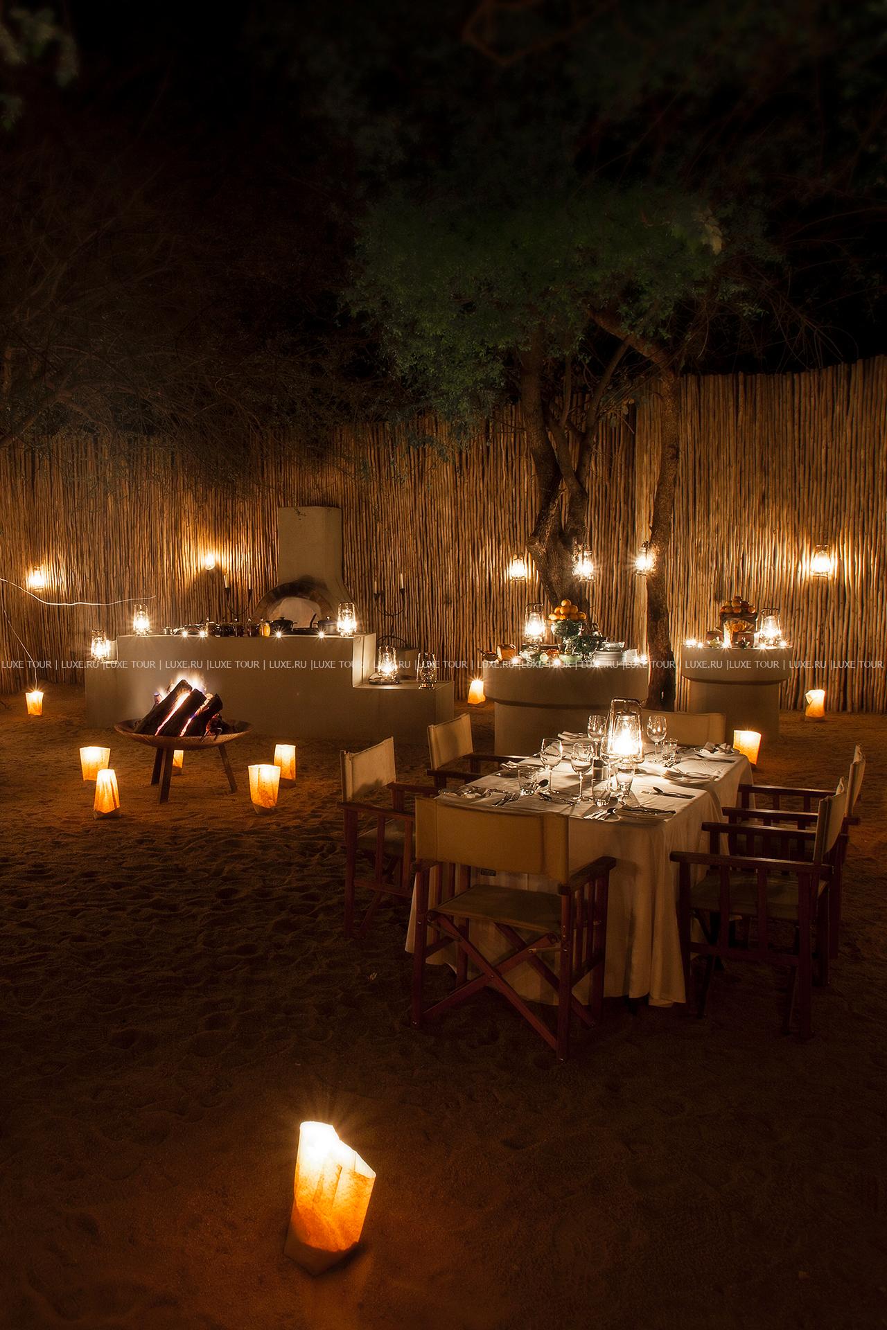 В каждом лагере и в лодже: ресторан-столовая, бар, обеденный зал на открытом воздухе «бома».