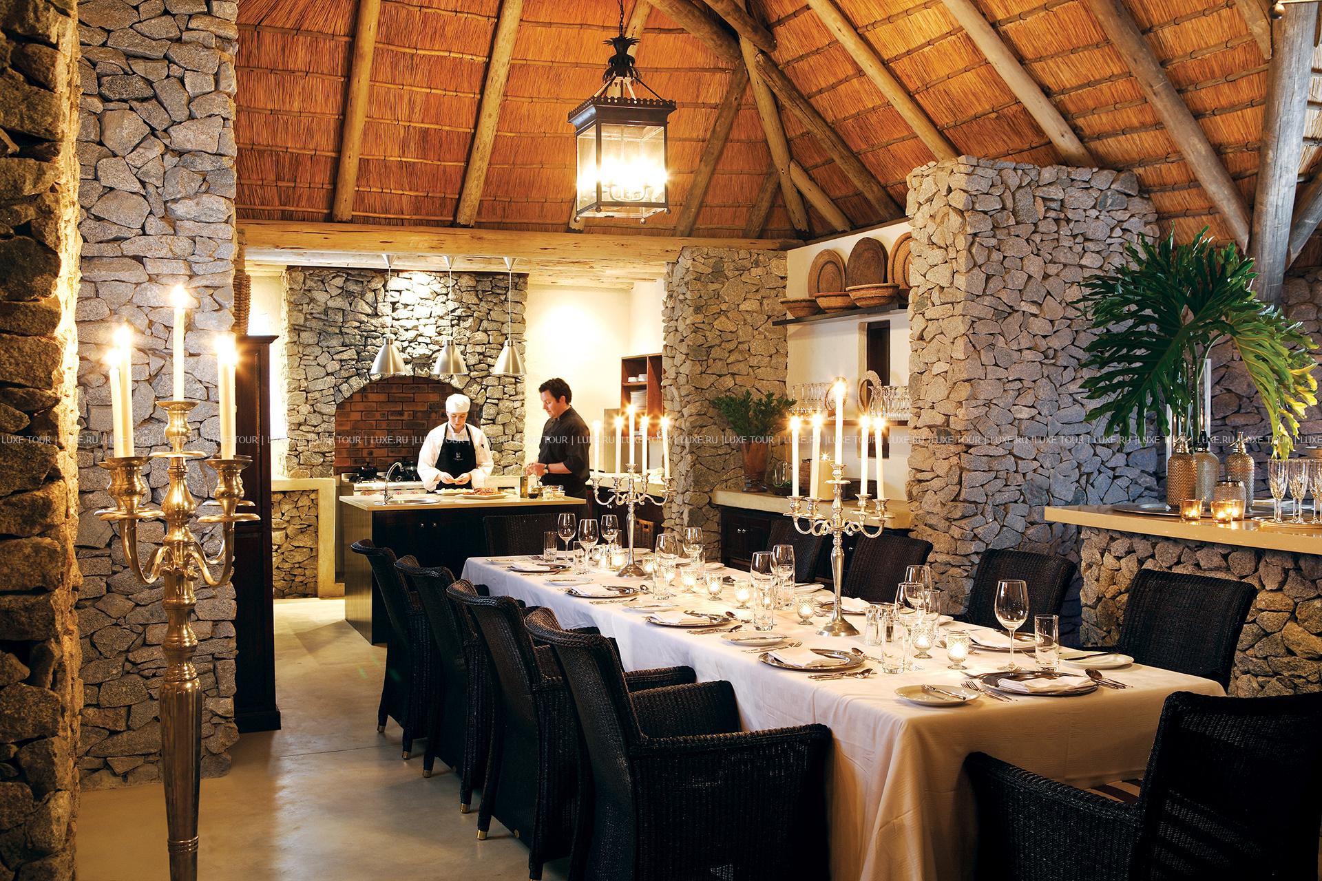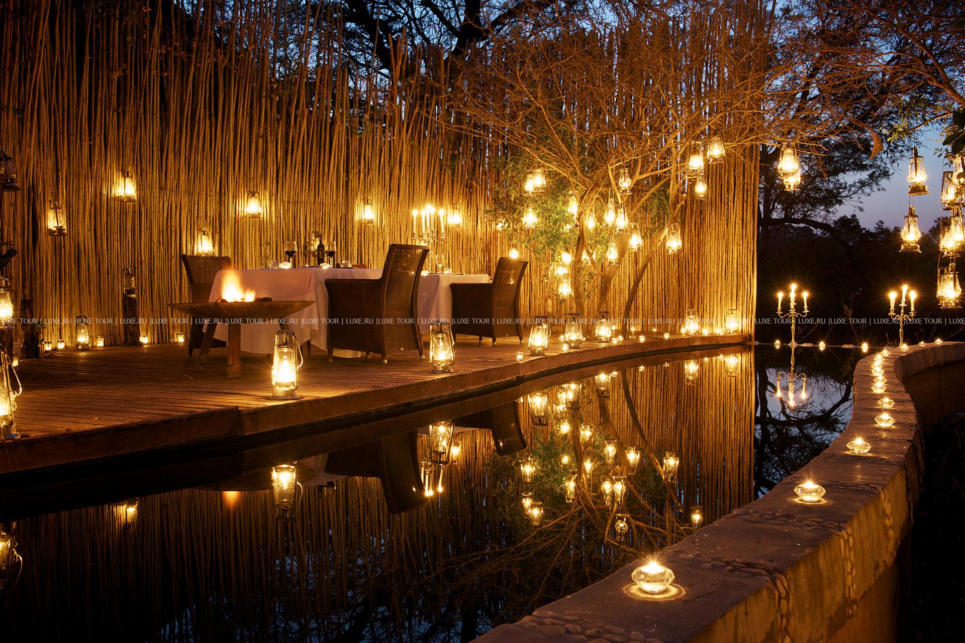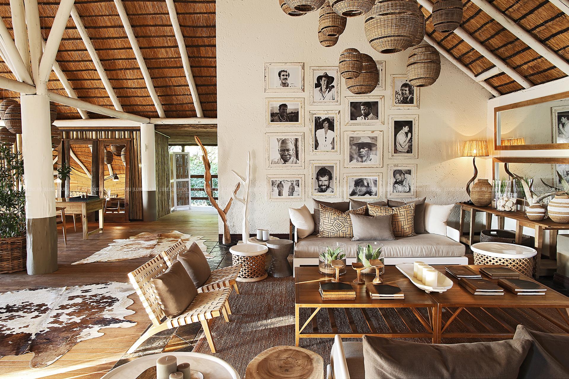 В каждом лагере и в лодже: ресторан-столовая, бар, обеденный зал на открытом воздухе «бома».