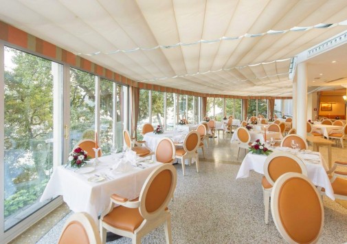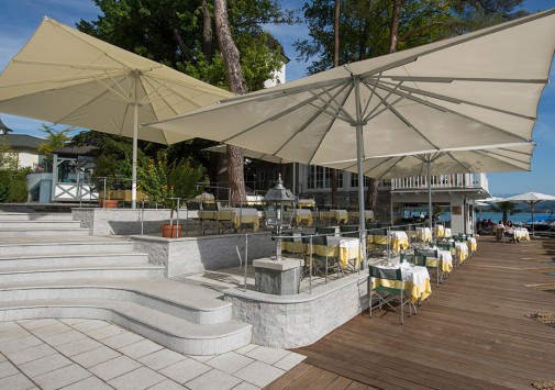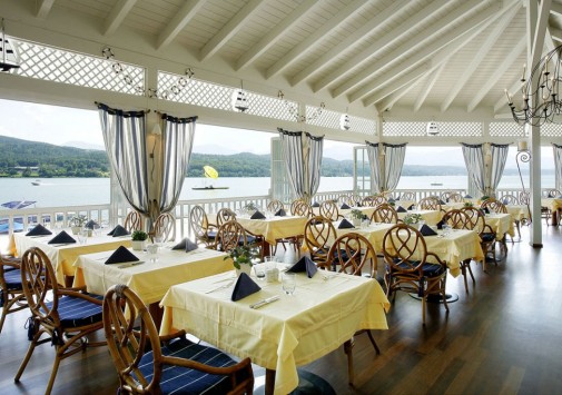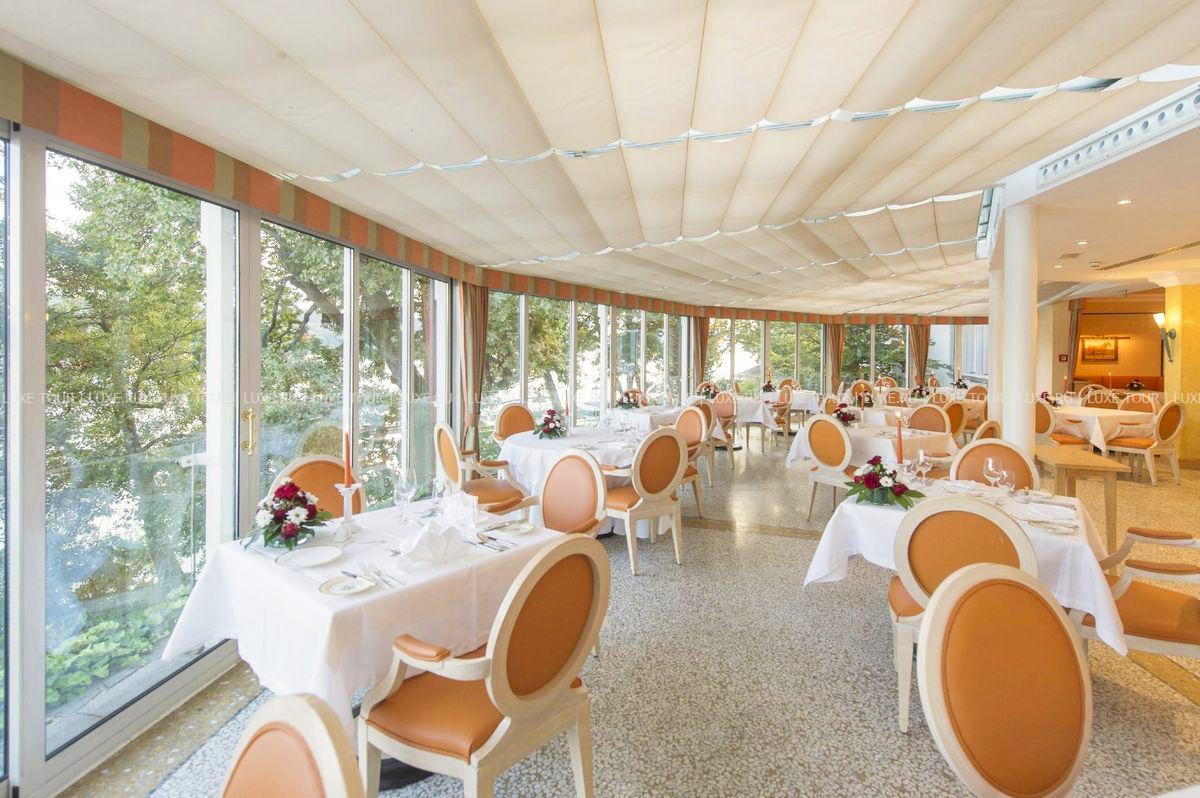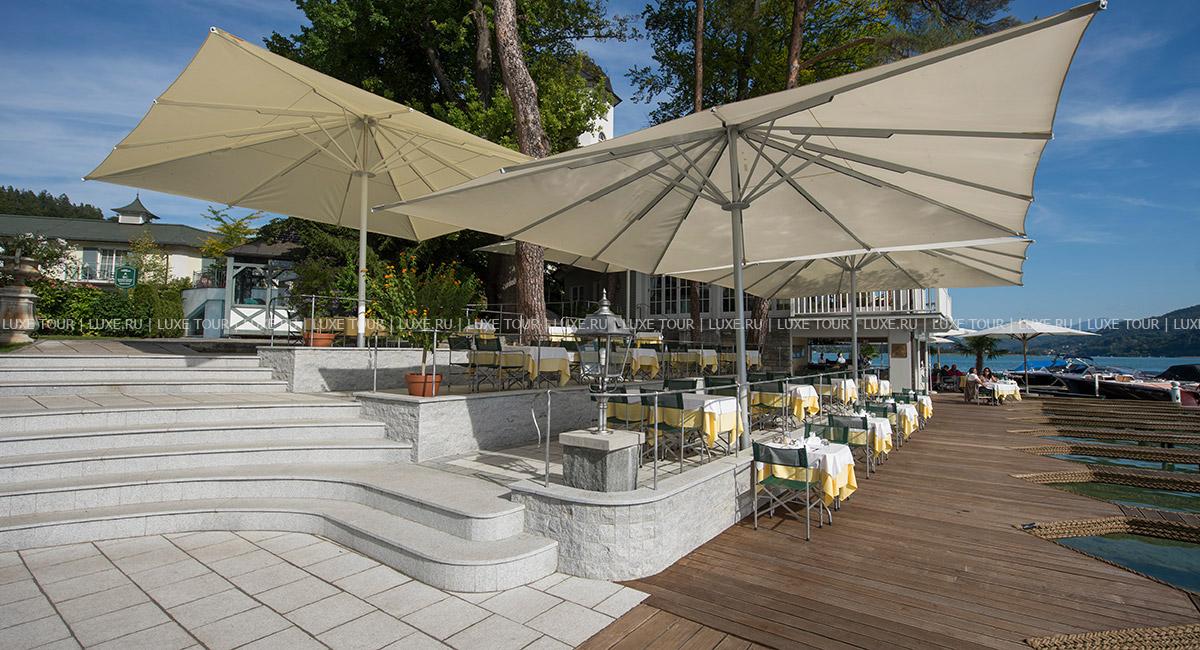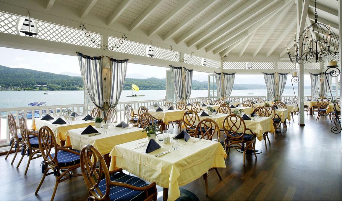 Гастрономический ресторан La Terrasse с великолепным видом на озеро, имеющий почетные награды от Gault Millau, предлагает деликатесы европейской кухни в сопровождении изысканной карты вин.