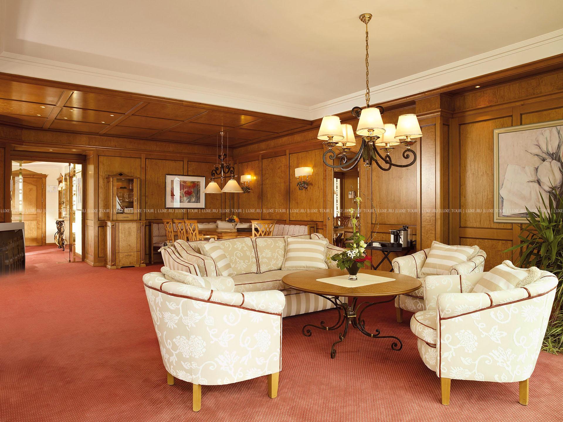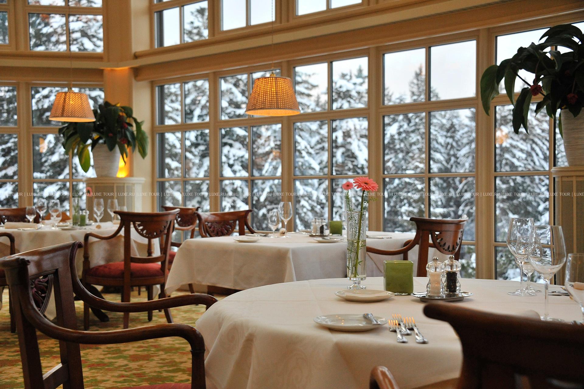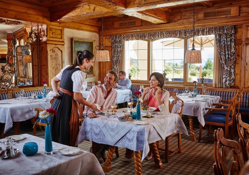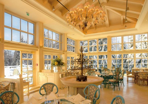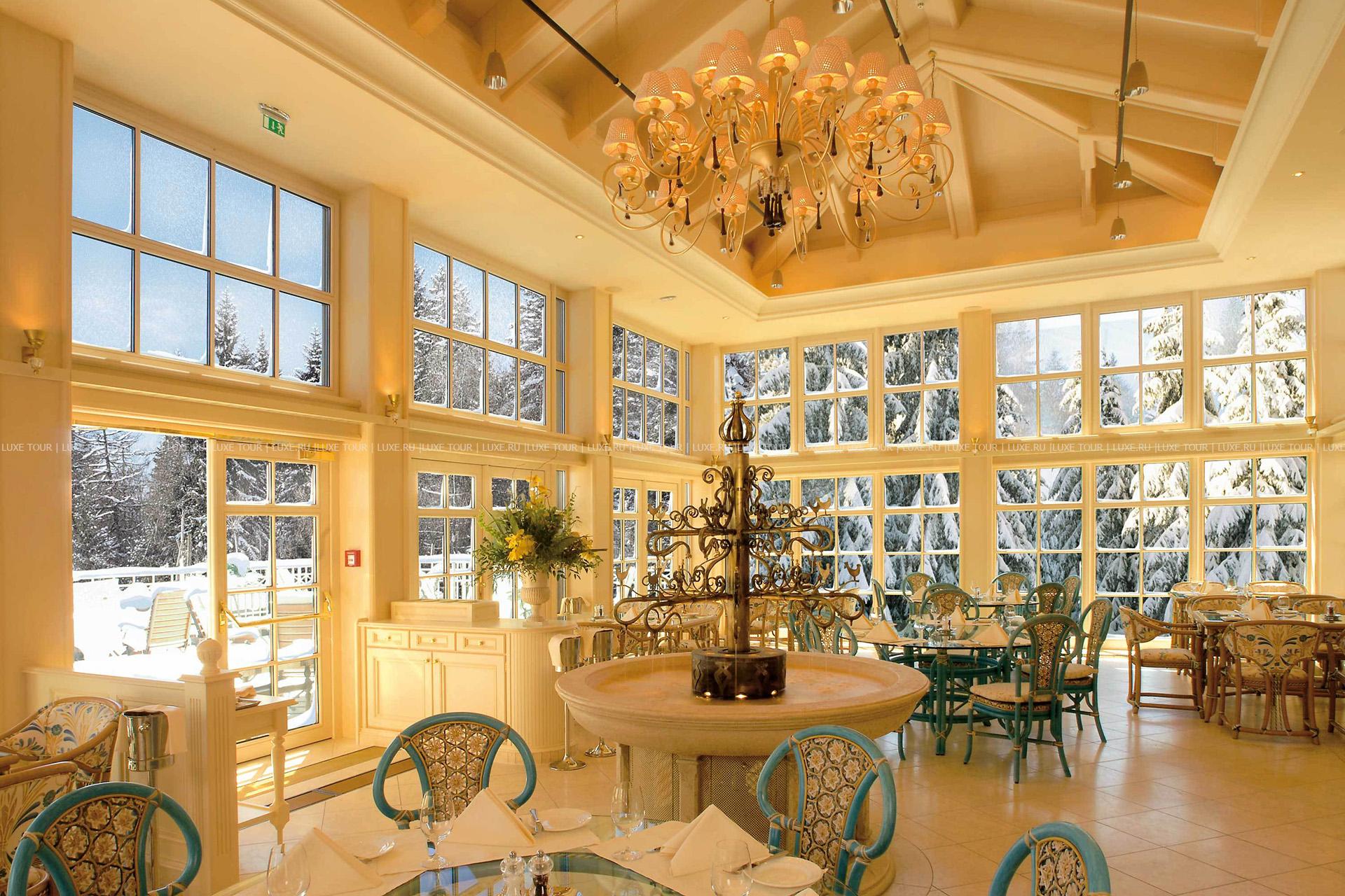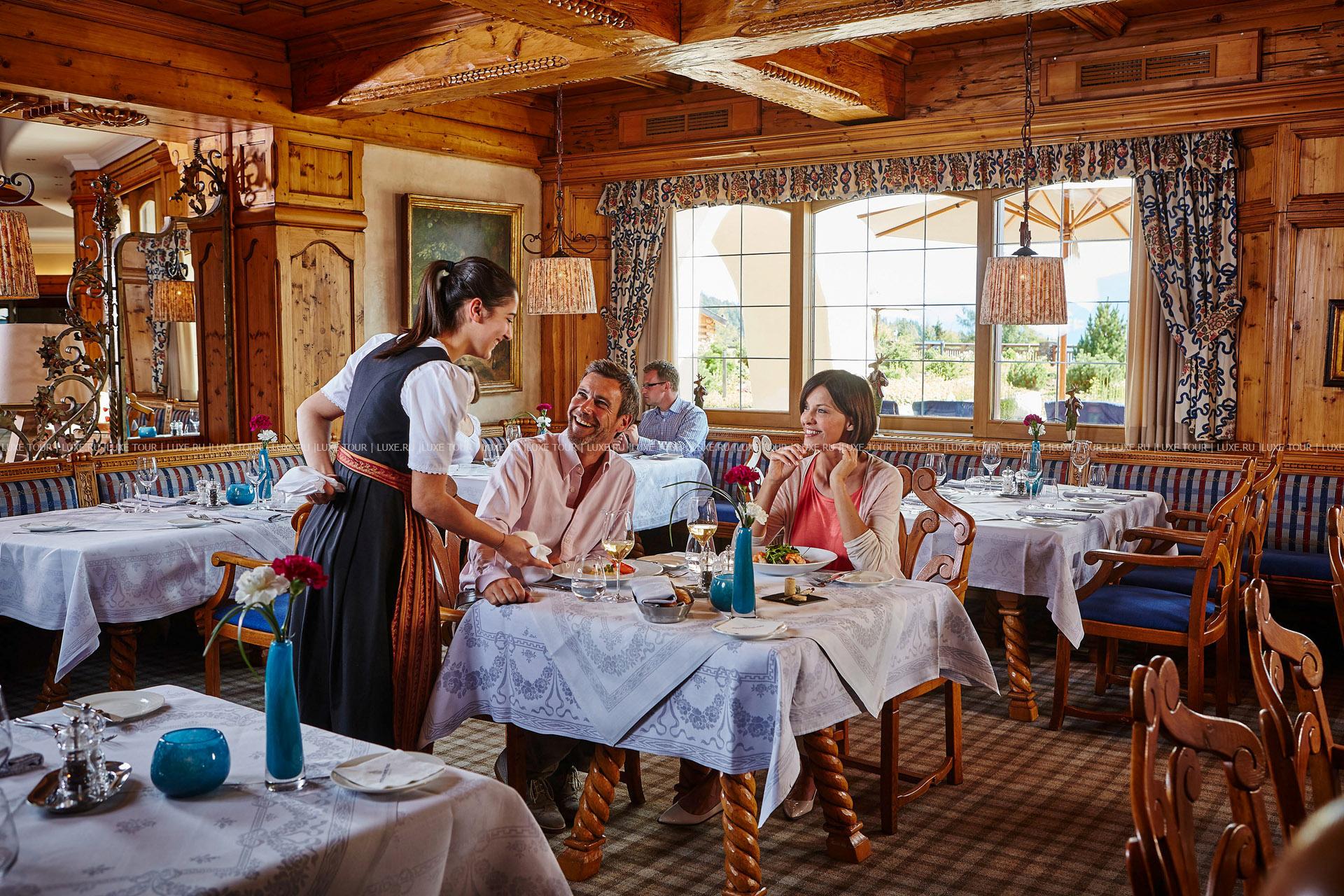 - Элегантный главный ресторан, предлагающий разнообразие блюд региональной и интернациональной кухни, оформлен в традиционном тирольском стиле и располагает зимним садом. Каждое воскресенье в ресторане устраивается торжественный ужин с музыкальной программой.