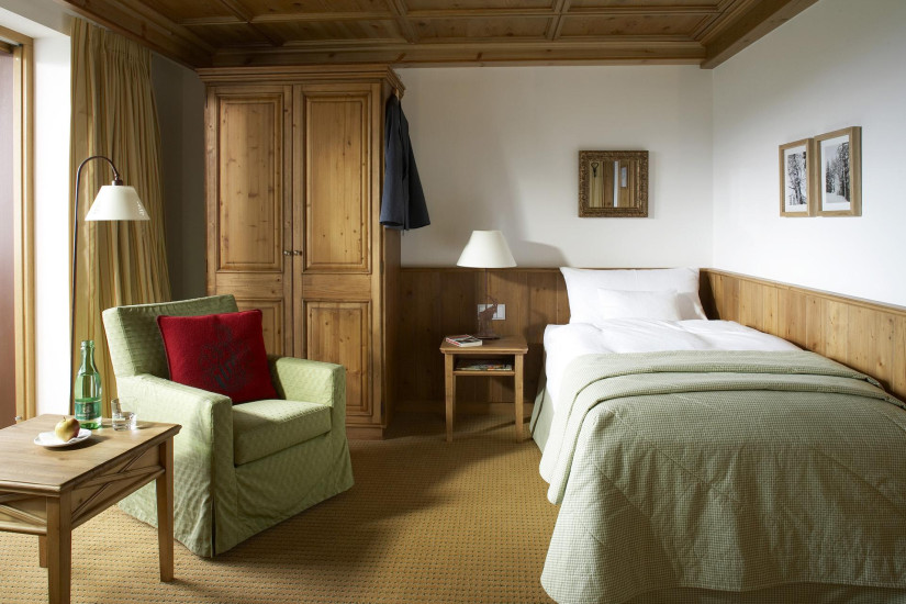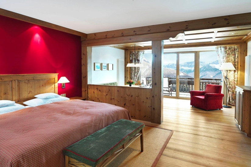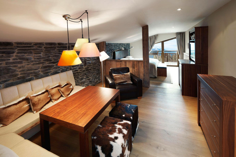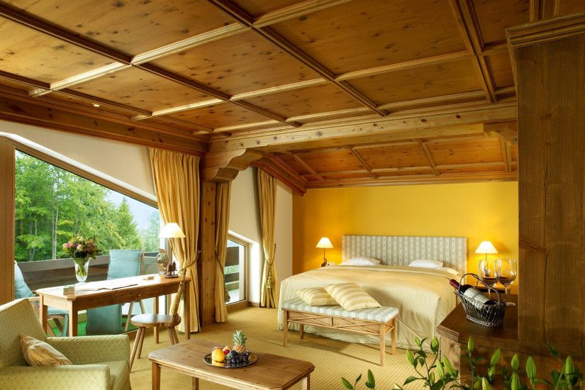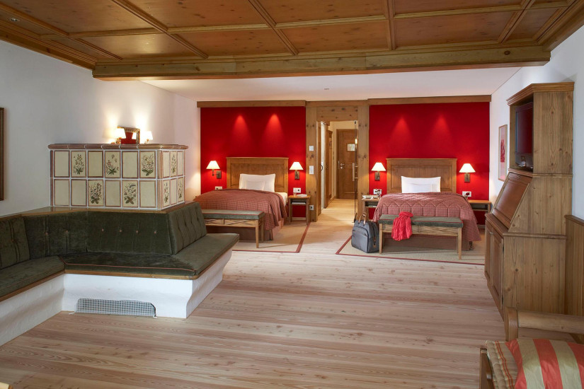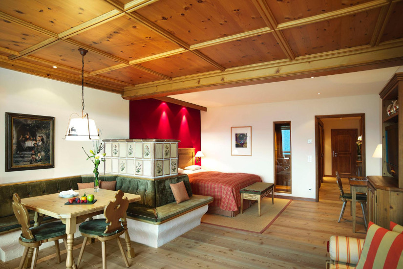 - 68 м2. Состоит из спальни с двуспальной кроватью (в некоторых номерах имеется вторая спальня), гостиной зоны с тирольской печью, ванной комнаты с ванной и отдельным душем, гардеробной, балкона или террасы.