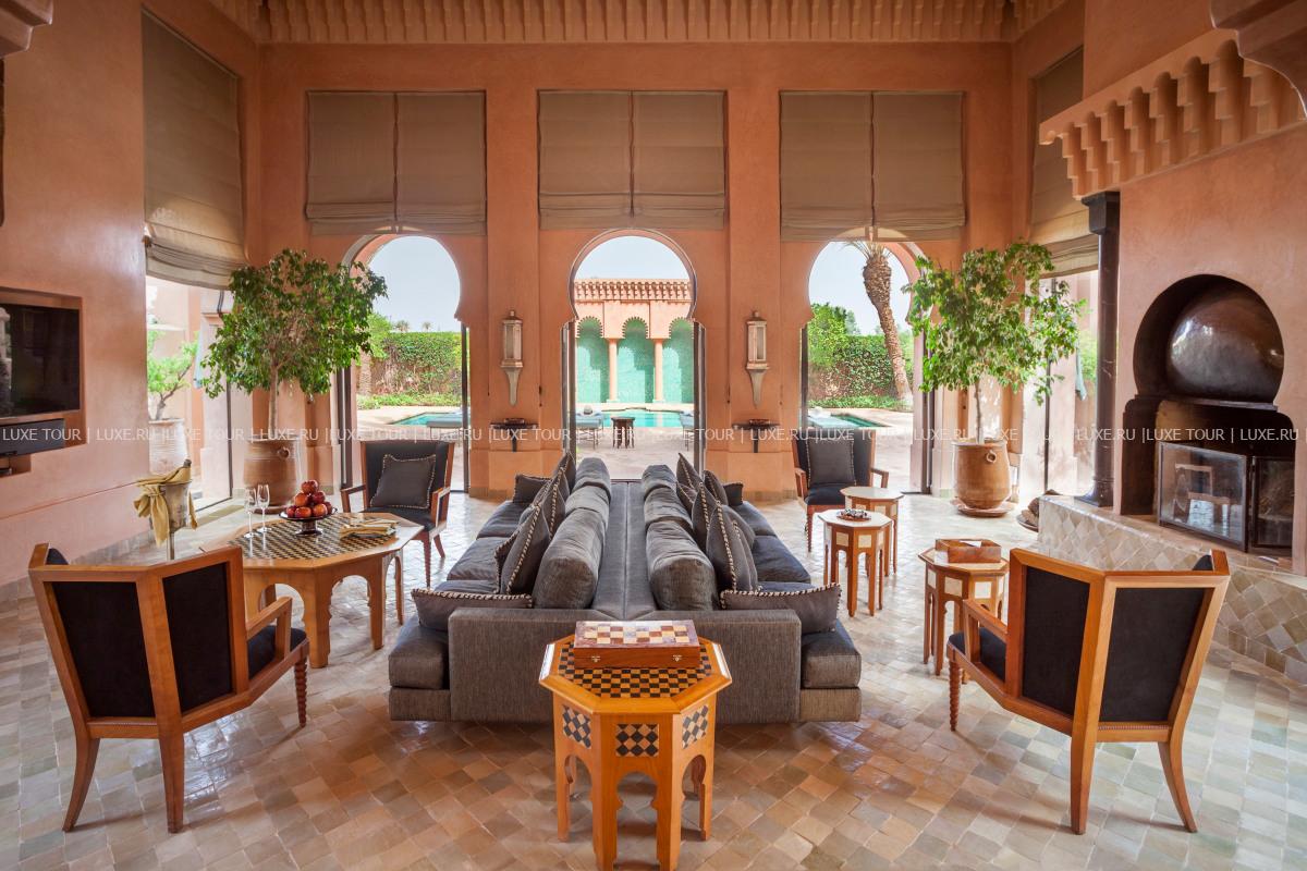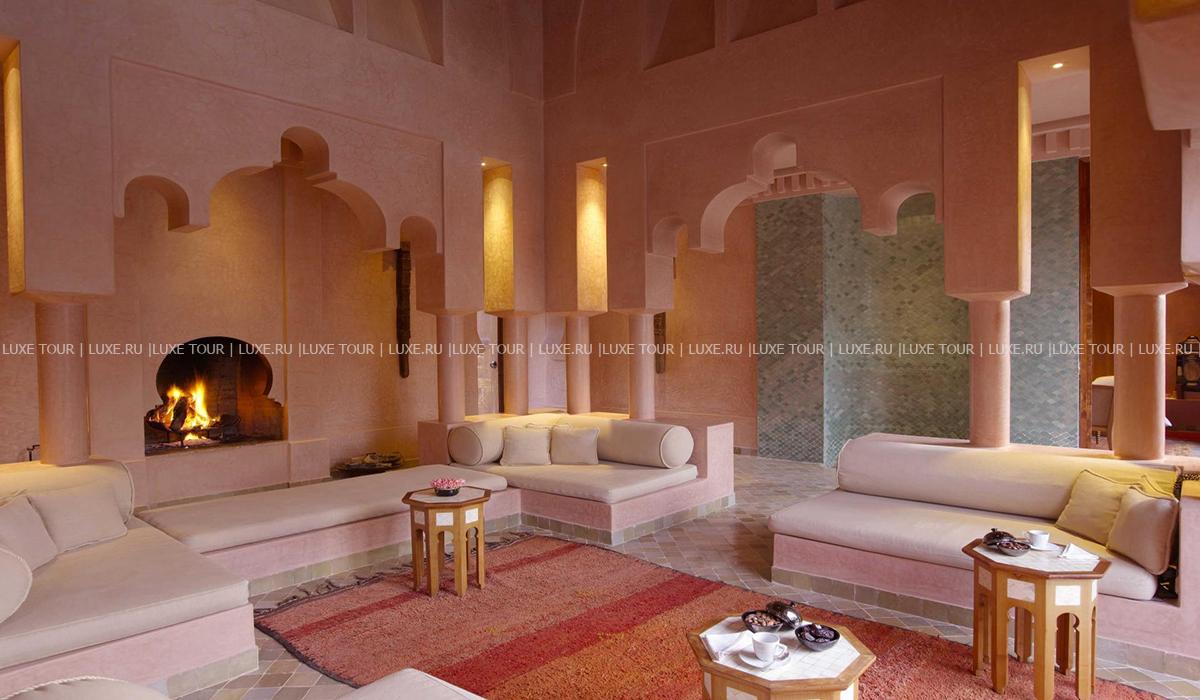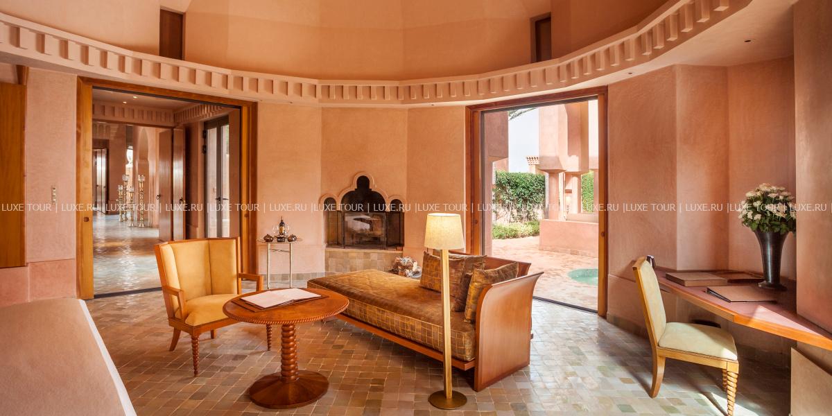 Массивные дубовые двери открывают перед гостями центральную аллею, приветливо встречающую всех играющими фонтанами и стройными колоннами. Здесь на обширной территории располагаются 2 ресторана и бар, библиотека, спа-центр, включающий открытый бассейн с подогревом, небольшой детский бассейн, турецкие бани, тренажерный зал, и 2 теннисных корта с глиняным покрытием. Кроме того, в 15 павильонах гостиницы имеются отдельные бассейны. В нескольких минутах от гостиницы находятся 2 поля для гольфа Amelks Golf Course и Royal Golf de Marrakech.