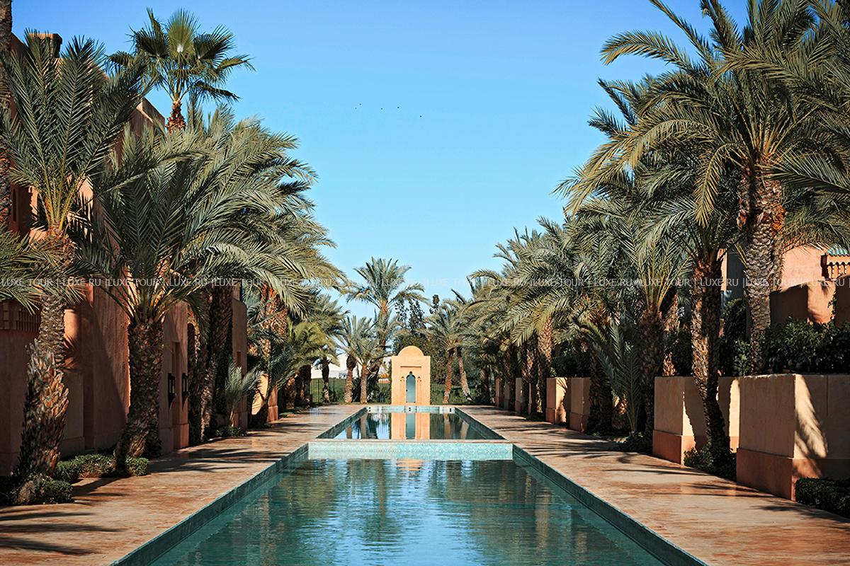 Небольшой отель Amanjena Palace (Amanjena в переводе с арабского означает «безмятежный рай») расположен в 15 минутах от аэропорта Марракеша, недалеко от центральной части города. Впервые открывший свои двери в 2000 году Amanjena стал первым отелем цепочки Amanresorts на африканском континенте. 34 павильона и 6 двухэтажных домов (Maison),а также грандиозная вилла Al-Hamra Maison, занимающая площадь более 750 м2, размещаются среди идиллического оазиса стройных пальм и пышных оливковых деревьев. Дизайн всех зданий, окрашенных в воздушный розовый цвет, имитирует старинные мавританские постройки — pisé — а также внешний вид берберских деревенек, затерянных в горах Высокого Атласа, и напрямую соотносится с традиционным обликом Марракеша, известного в арабском мире как Al Medina al-Hamra, «Красный город». Славная история города восходит к середине XI века, когда представители воцарившейся в северо-западной Африке династии Альморавидов сумели наладить искусственное орошение земель этого региона. Вода выступает не менее важным элементом в парковом ансамбле и самого отеля, важнейшей частью которого является огромный bassin, ранее использовавшийся для накапливания воды для ирригационных целей. Вокруг главного бассейна разбросаны павильоны и дома, отделенные друг от друга отдельными бассейнами, гармонично объединяющими лужайки и виноградные лозы, изумрудные крыши, мраморные фонтаны и сверкающие в лучах солнца сделанные вручную кафельные плитки (zellij).