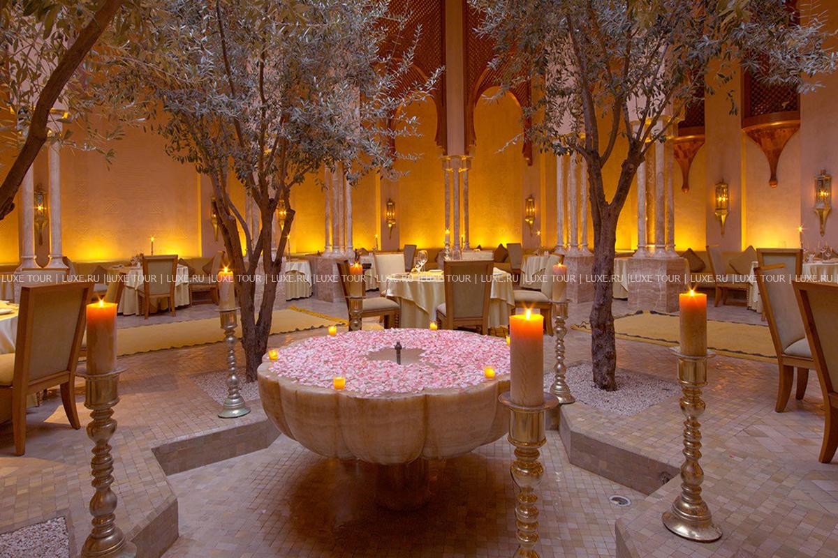 • Главный ресторан, неповторимую атмосферу которого создают удивительный фонтан, окруженный оливковыми деревьями и узорчатыми колоннами, а также сужающиеся своды застекленной крыши, специализируется на блюдах традиционной марокканской и международной кухни.
