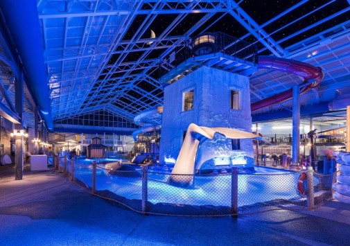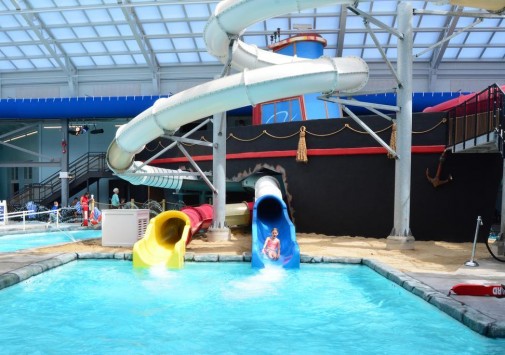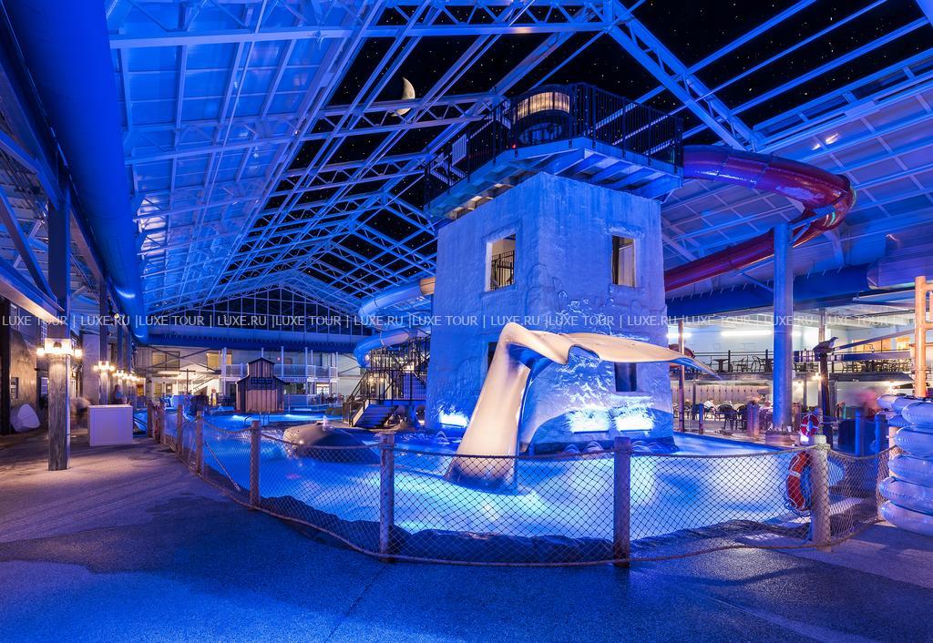 Огромный бассейн с водяными горками и водопадами.