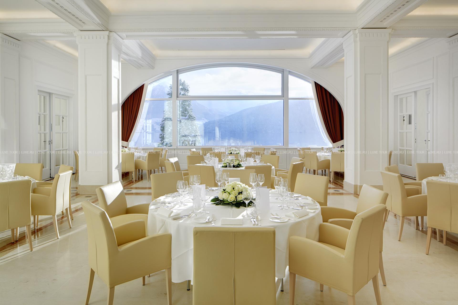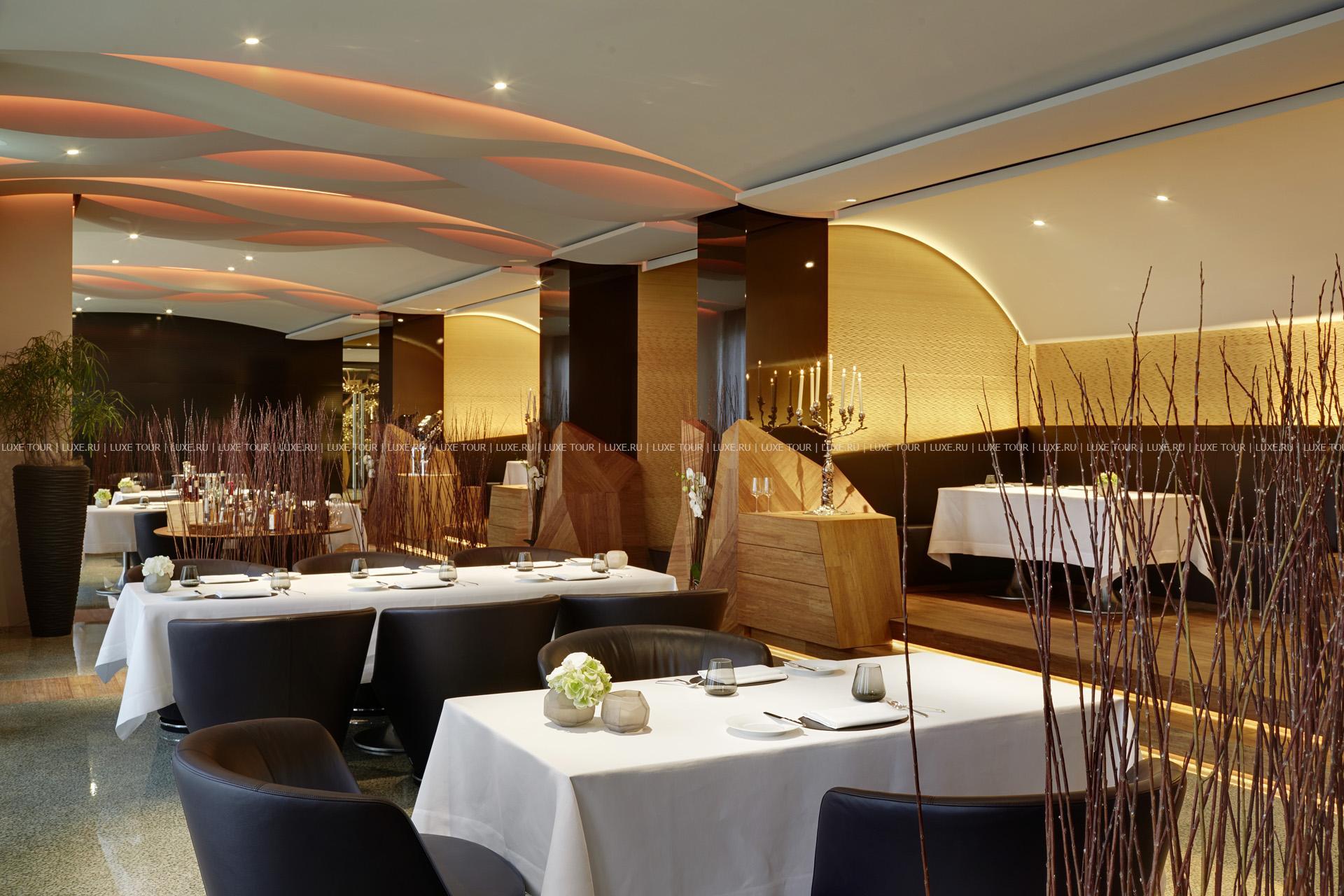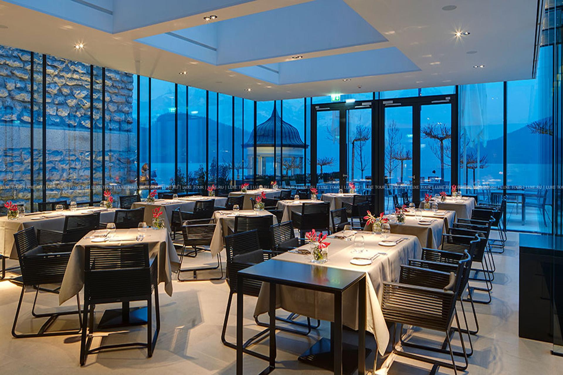 - Prisma – еще один изысканный ресторан, отмеченный «мишленовской» звездой и 16 очками гида Го-Мийо. В ресторане с 180-граудсным видом на озеро и горы подают фирменные блюда от шеф-повара Кристиан Никеля, который открывает гостям уголки разных стран мира – от индийского карри и соли из Гималаев, до испанского хамона «Пата Негра» и сока юзу из Японии.