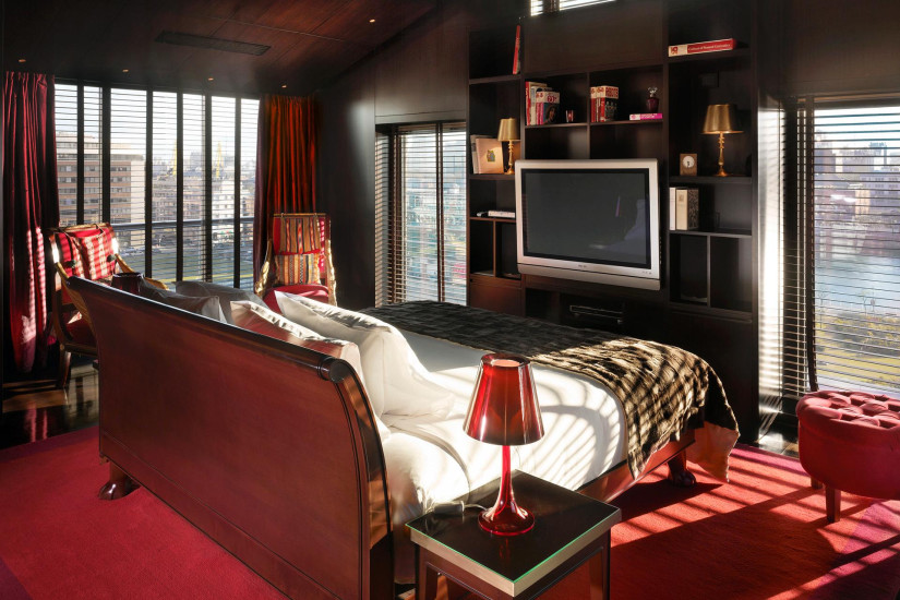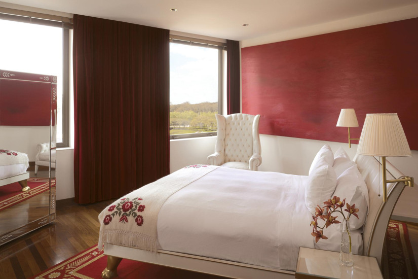 - 150 м2. Трехуровневый номер на 8 этаже состоит из спальни с кроватью king-size и уборной - на третьем этаже, ванной комнаты с зоной отдыха, гидромассажной ванной, отдельным душем и туалетной комнатой - на втором этаже, а также гостиной с обеденной зоной на 4 персоны - на первом этаже. Вид на парк и реку.