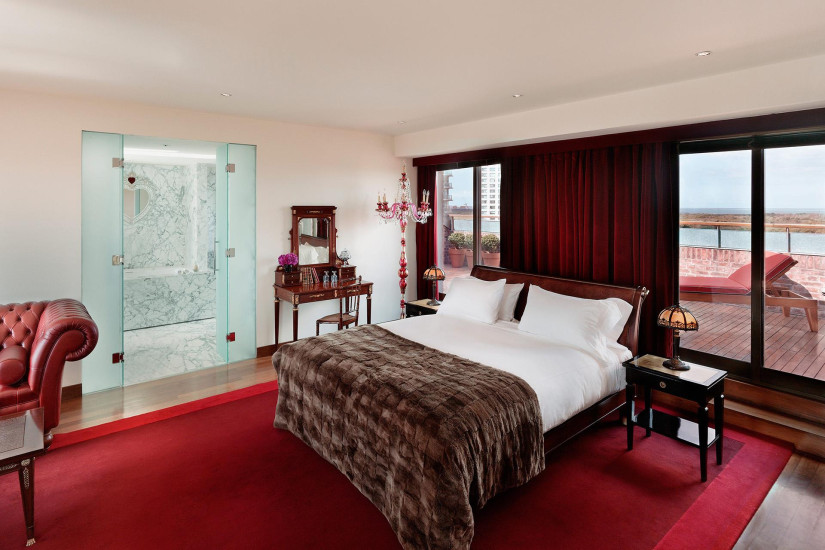 - 360 м2. Двухуровневый номер на 8 этаже состоит на втором этаже: из двух спален (одна - с кроватью king-size, вторая - с двумя кроватями twin), двух ванных комнат (одна - с гидромассажной ванной и отдельным душем, другая - с ванной и отдельным душем), двух гардеробных и двух террас, а также, на первом этаже: гостиной, столовой с обеденнным столом на 10 персон, полностью оборудованной кухни и гостевой уборной. Имеет панорамный видом на город, парк и залив.