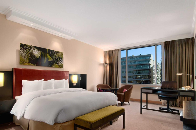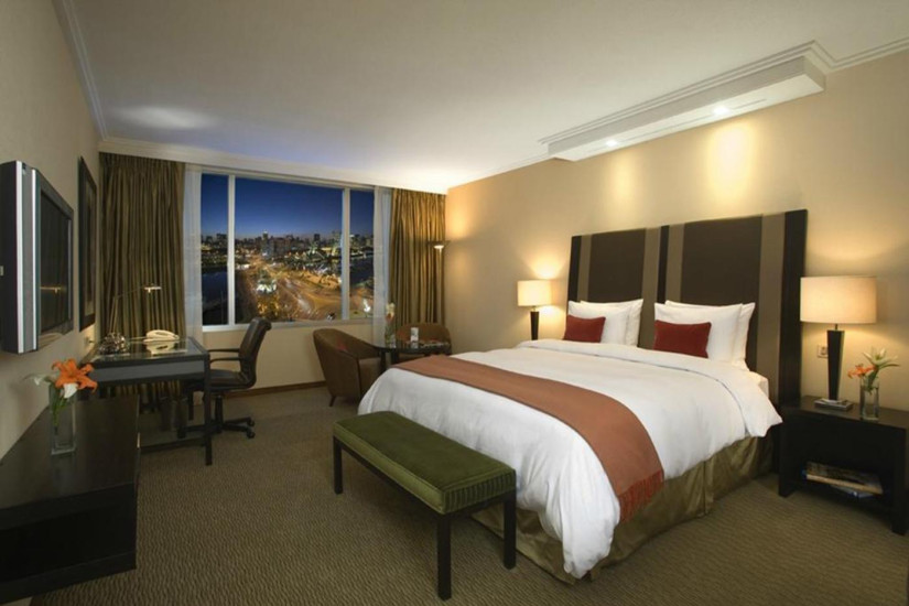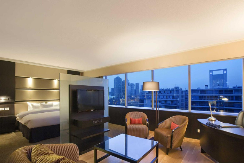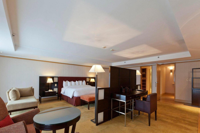 - 105 м2. Состоит из спальни с кроватью king-size и рабочей зоны, отдельной гостиной с обеденным столом, гардеробной, ванной комнаты с ванной и отдельным душем, гостевой уборной. Вид на город. Гостям предоставляется бесплатный доступ в Executive Lounge.