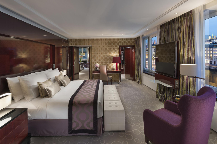 - 505 м2. Роскошный номер с отдельным лифтом, состоит из пяти спален, каждая из которых имеет кровать king-size, зону отдыха, собственную ванную комнату (в главной спальне - с джакузи и душем) и гардеробную, также в люксе имеется две гостиные комнаты (одна - с камином), отдельная столовая комната с обеденным столом на 12 персон, гостевая уборная и панорамная терраса с обеденной зоной, выход на которую есть из каждой спальни. Из номера открывается панорамный вид на реку, город и Альпы. Максимальное размещение — 10 человек.