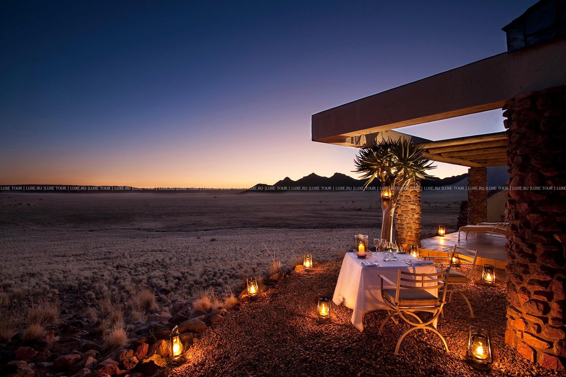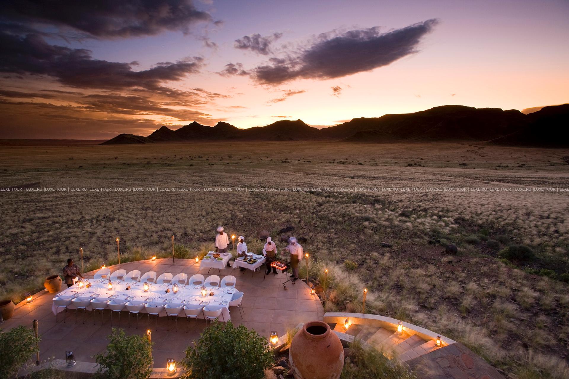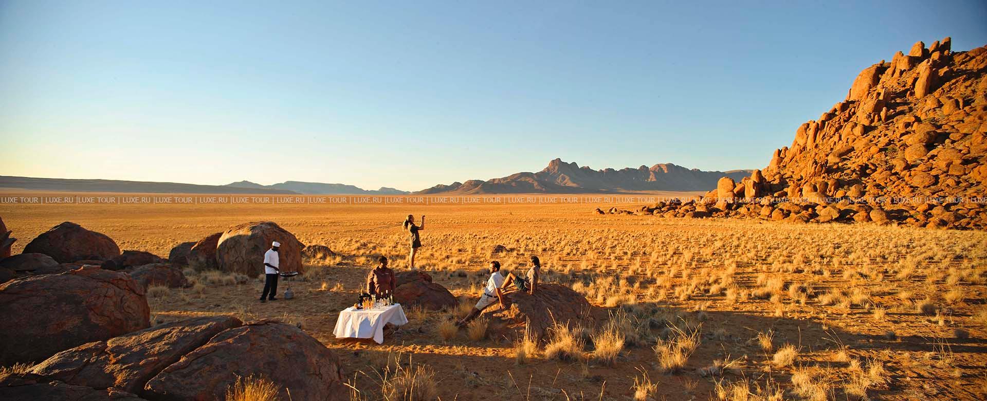- Во время сафари и экскурсий организуются пикники на природе с коктейлями или винами и легкими закусками. Ужин из 3-х блюд , международная кухня и ассортимент местных намибийских блюд, превосходные марочные вина.