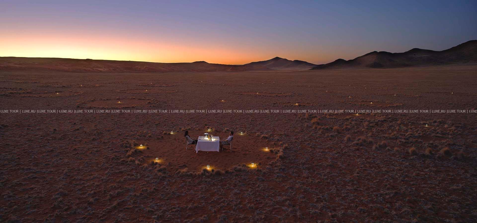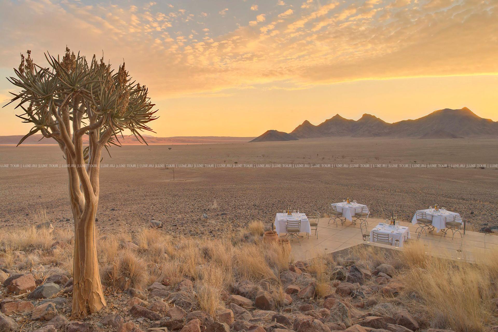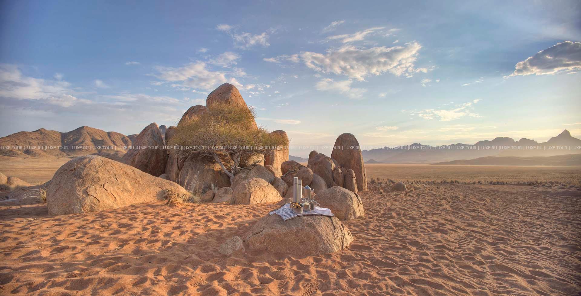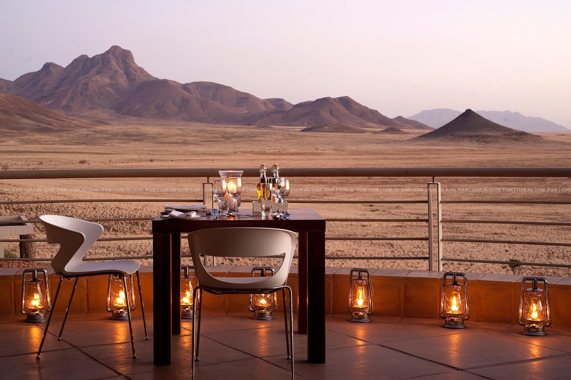 - Во время сафари и экскурсий организуются пикники на природе с коктейлями или винами и легкими закусками. Ужин из 3-х блюд , международная кухня и ассортимент местных намибийских блюд, превосходные марочные вина.