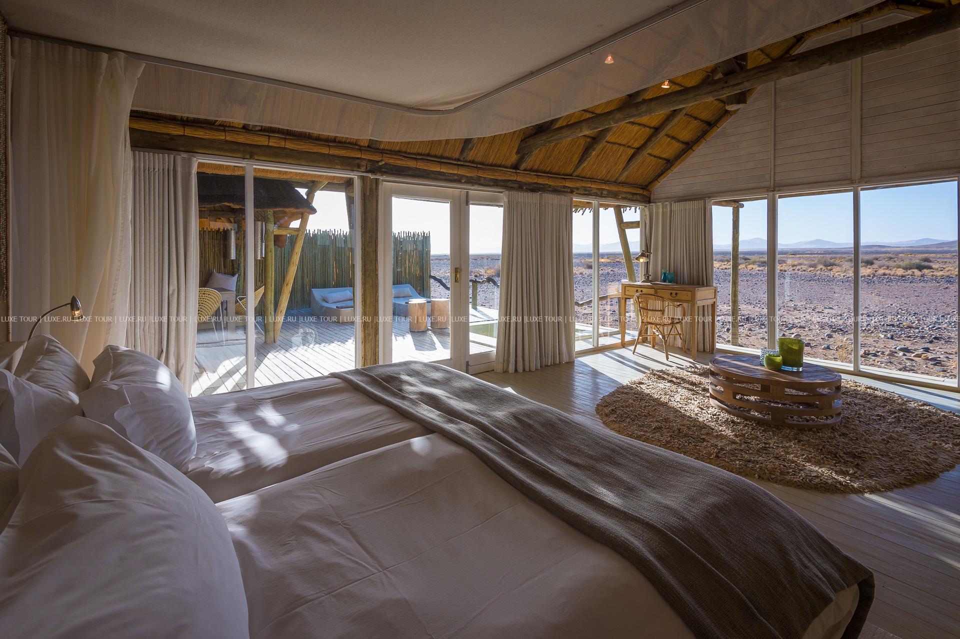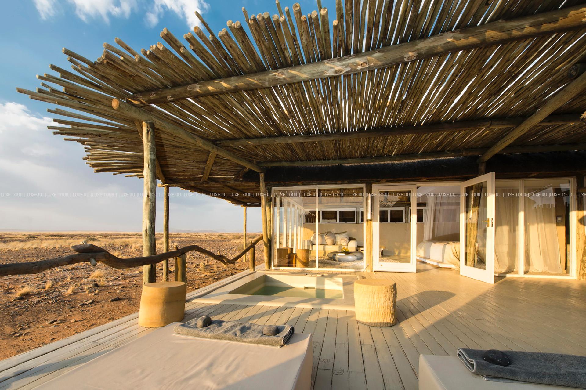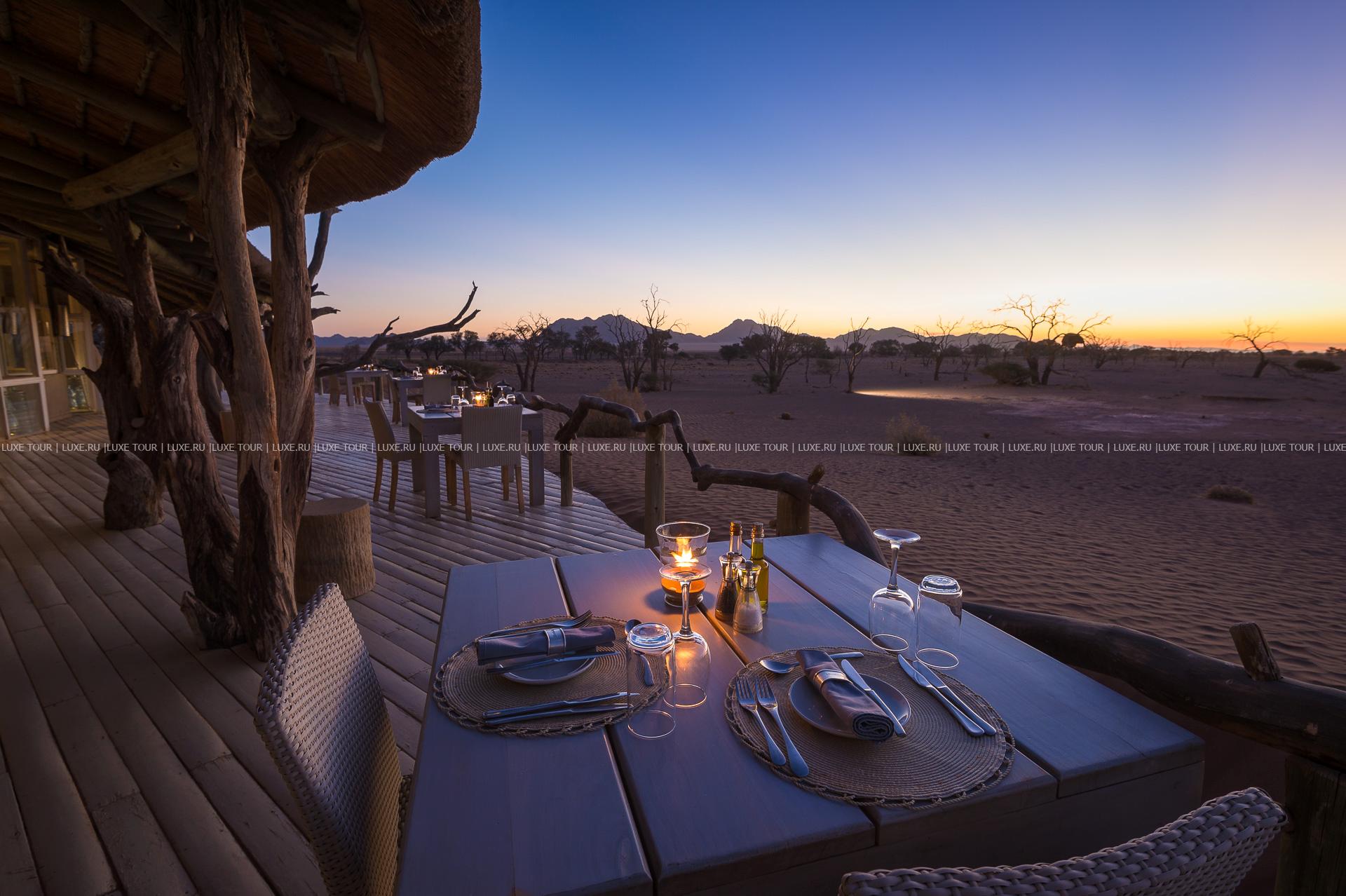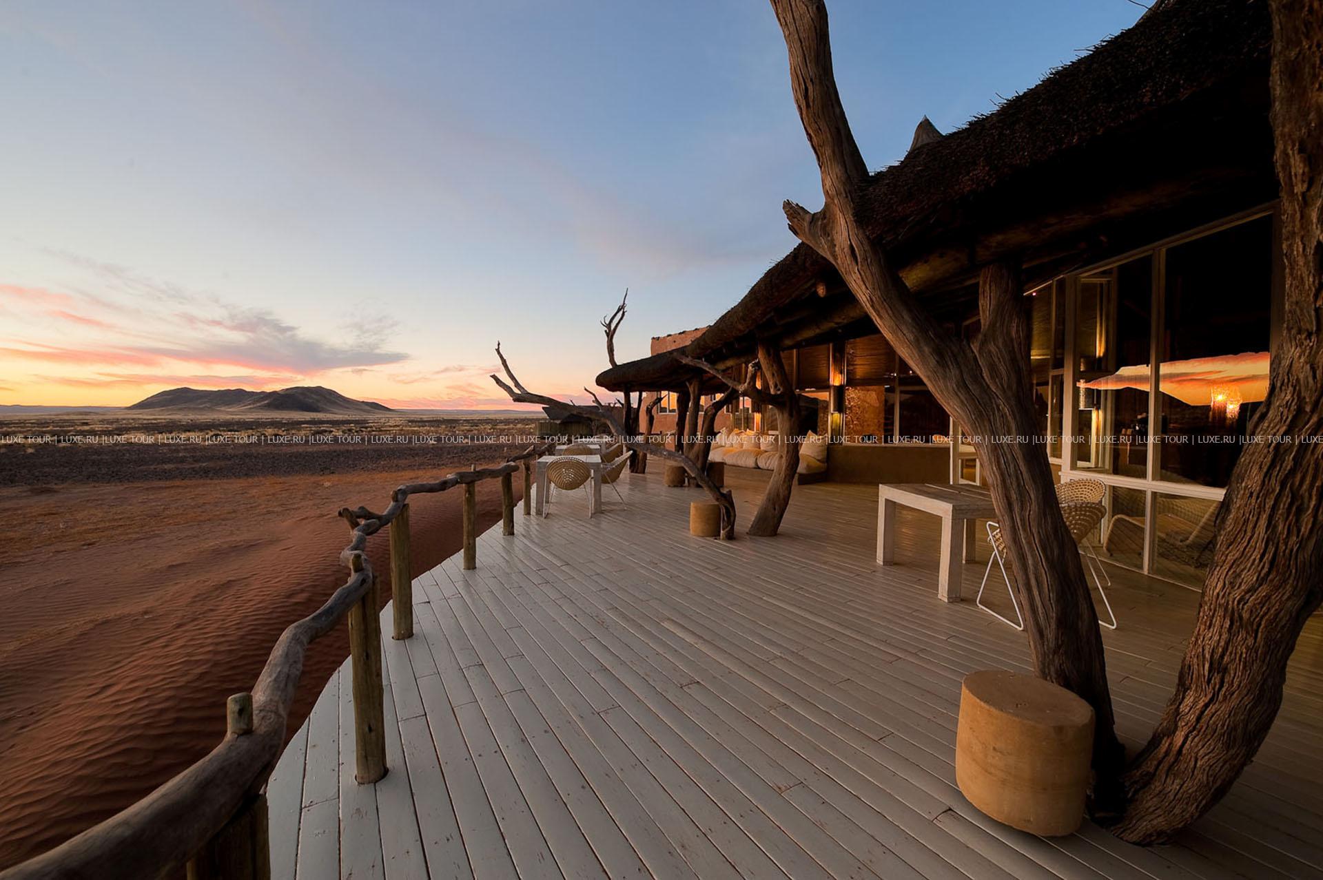 Гостей лоджа ждет путешествие на воздушном шаре над живописными, переливающимися всеми оттенками красного песчаными дюнами, сафари на крытых лендроверах, пикники на закате на горных плато, экскурсии к местным племенам и пешие прогулки по пустыне.