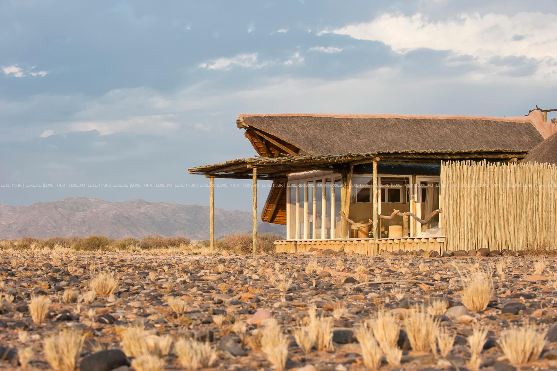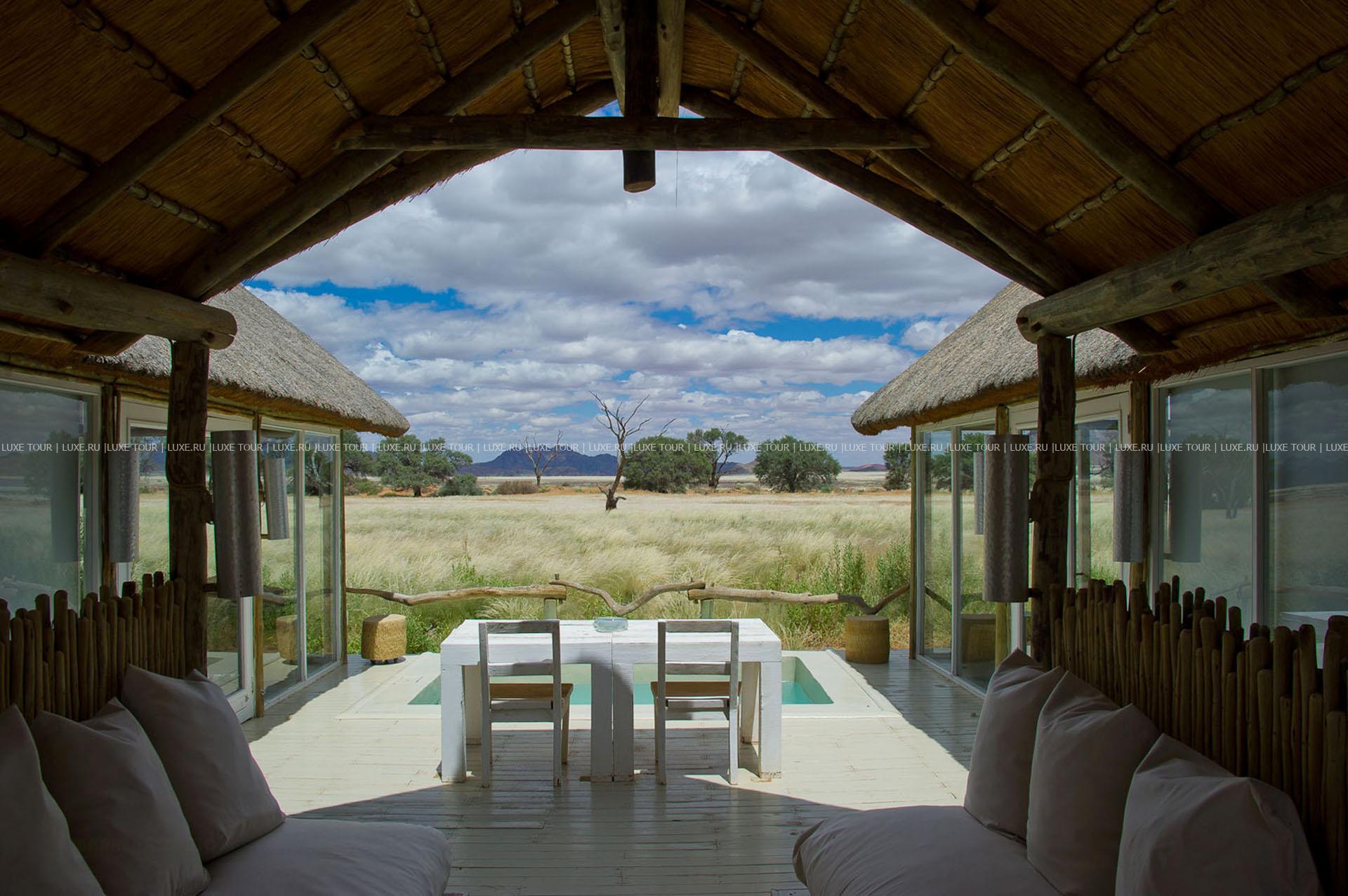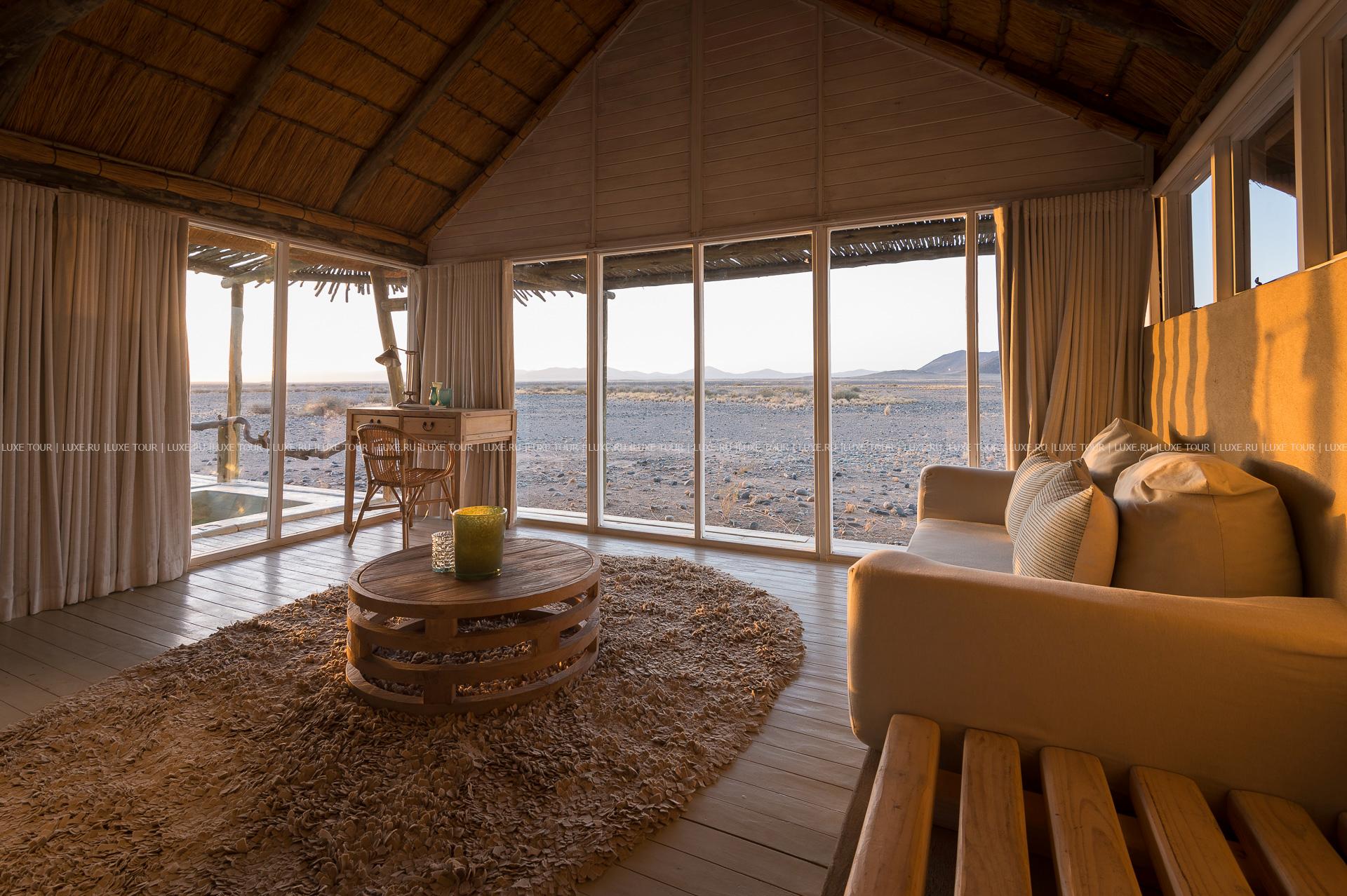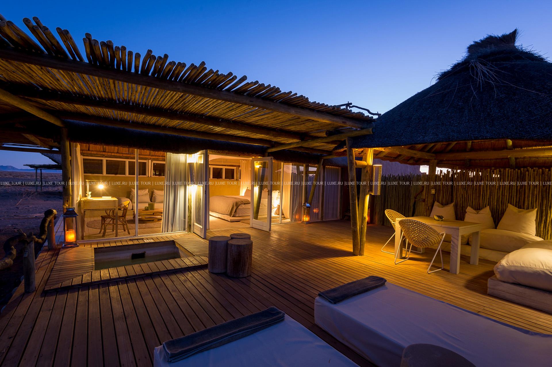 Гостей лоджа ждет путешествие на воздушном шаре над живописными, переливающимися всеми оттенками красного песчаными дюнами, сафари на крытых лендроверах, пикники на закате на горных плато, экскурсии к местным племенам и пешие прогулки по пустыне.