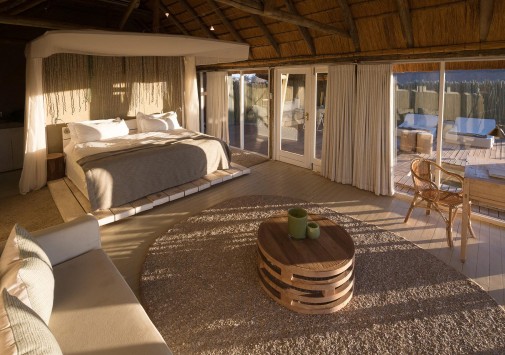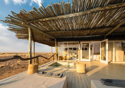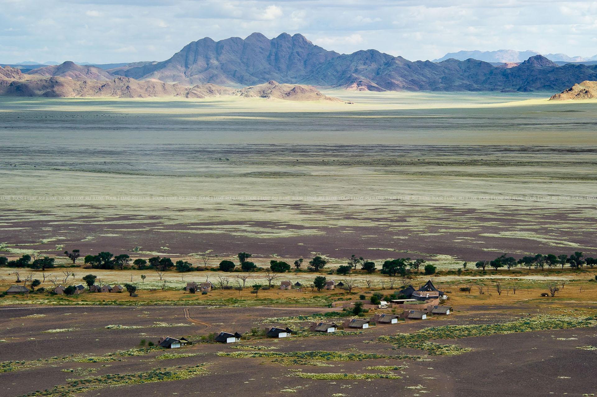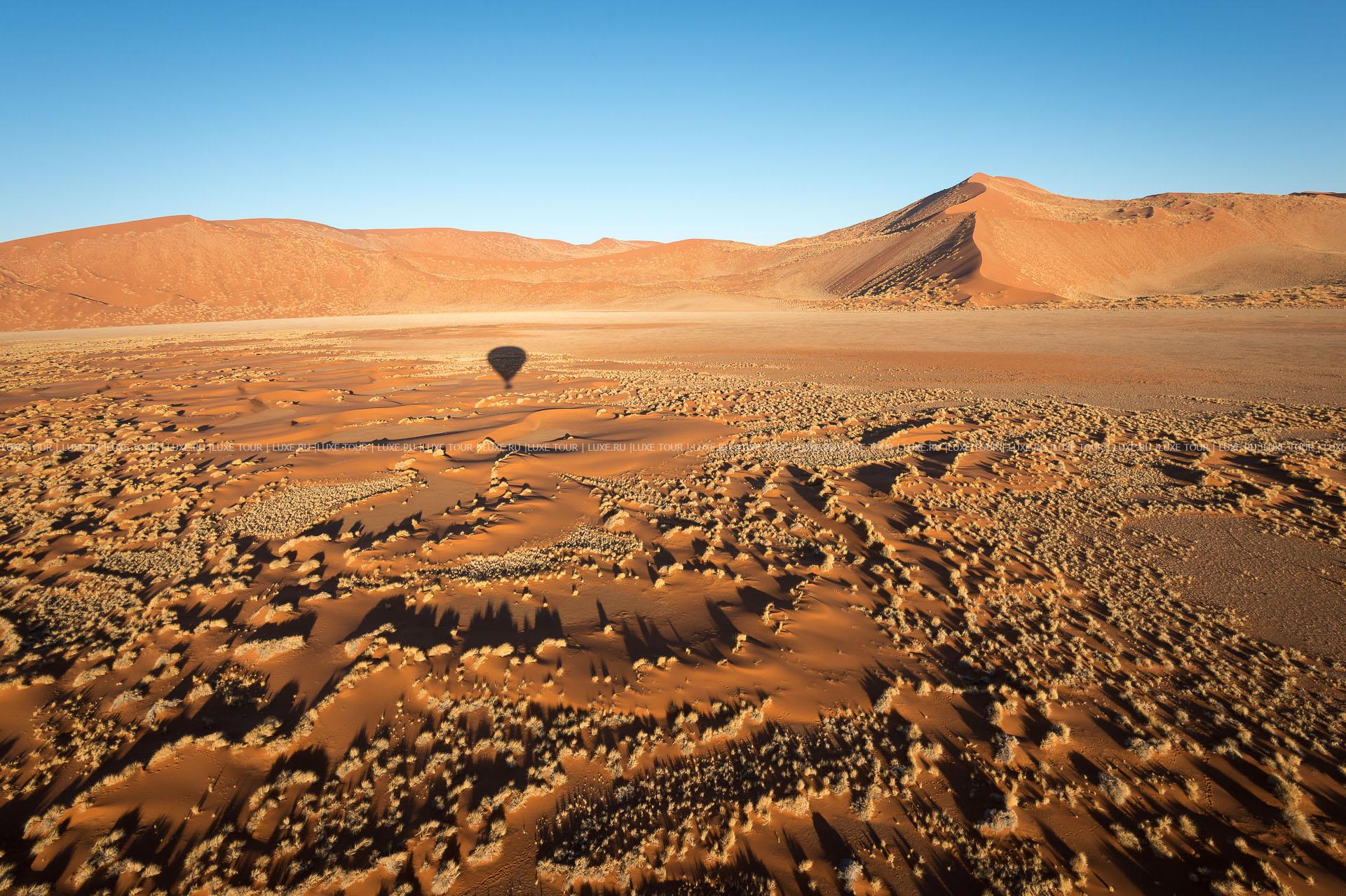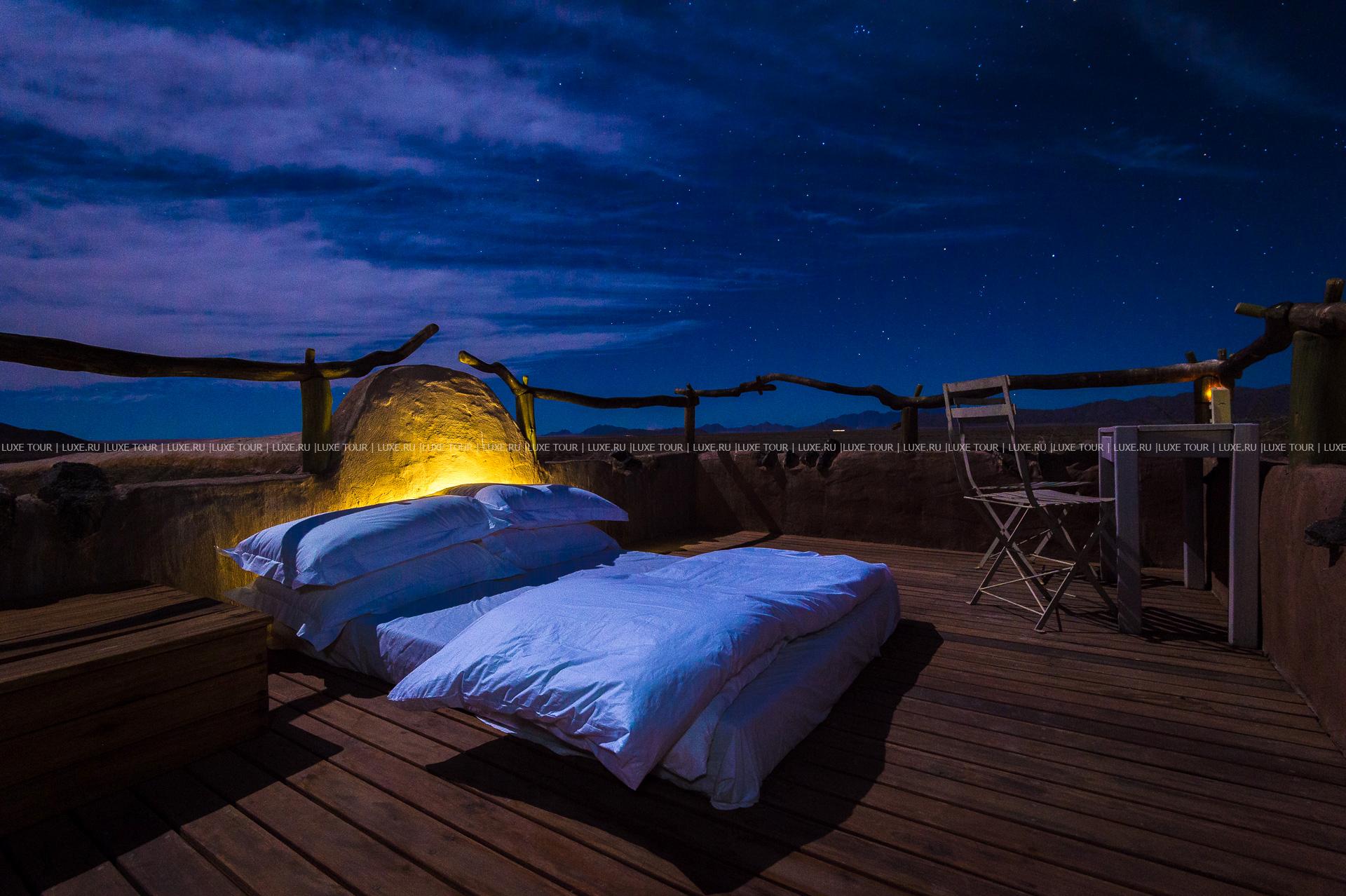 Гостей лоджа ждет путешествие на воздушном шаре над живописными, переливающимися всеми оттенками красного песчаными дюнами, сафари на крытых лендроверах, пикники на закате на горных плато, экскурсии к местным племенам и пешие прогулки по пустыне.