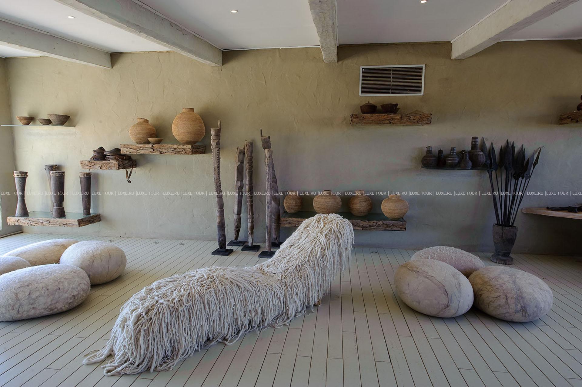 Внутренний декор выдержан в стиле африканского минимализма — с обилием льняных белых тканей.