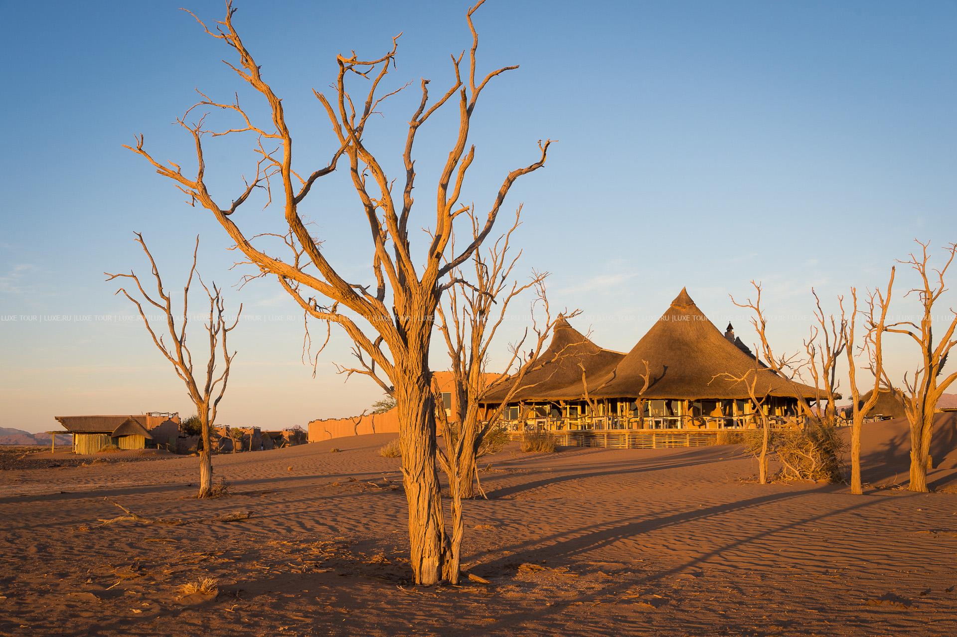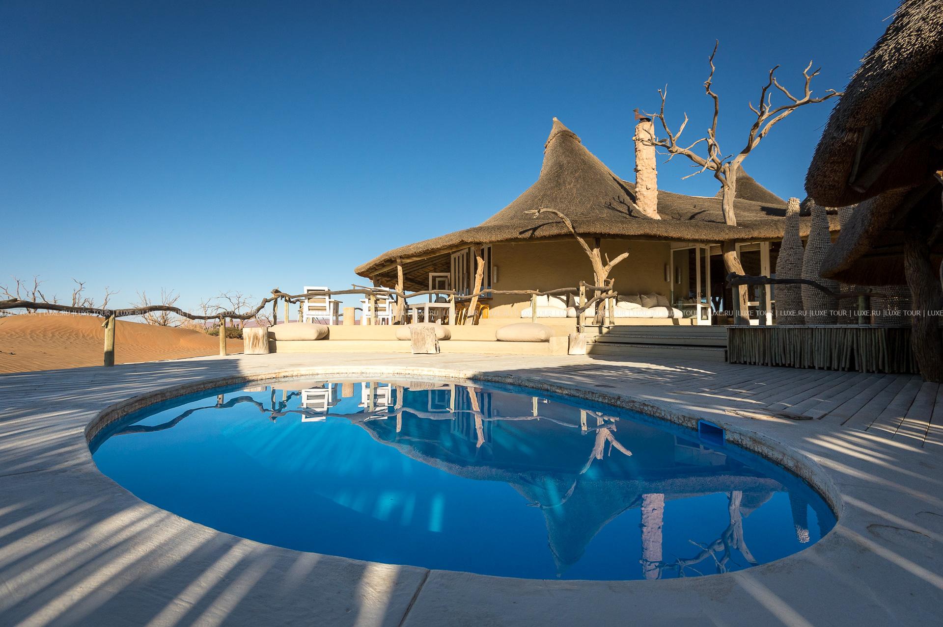 Открытый бассейн. Разнообразные развлекательные и познавательные мероприятия: полеты на воздушном шаре, сафари, экскурсии по дюнам, встреча заката в дюнах, верховая езда, экскурсии к бушменам.