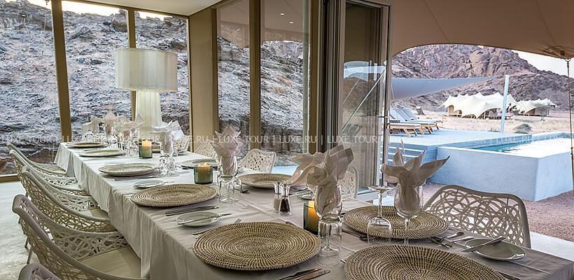 Во время сафари и экскурсий организуются пикники на природе с коктейлями или винами и легкими закусками. Ужин из 3-х блюд, международная кухня и ассортимент местных намибийских блюд, превосходные марочные вина.