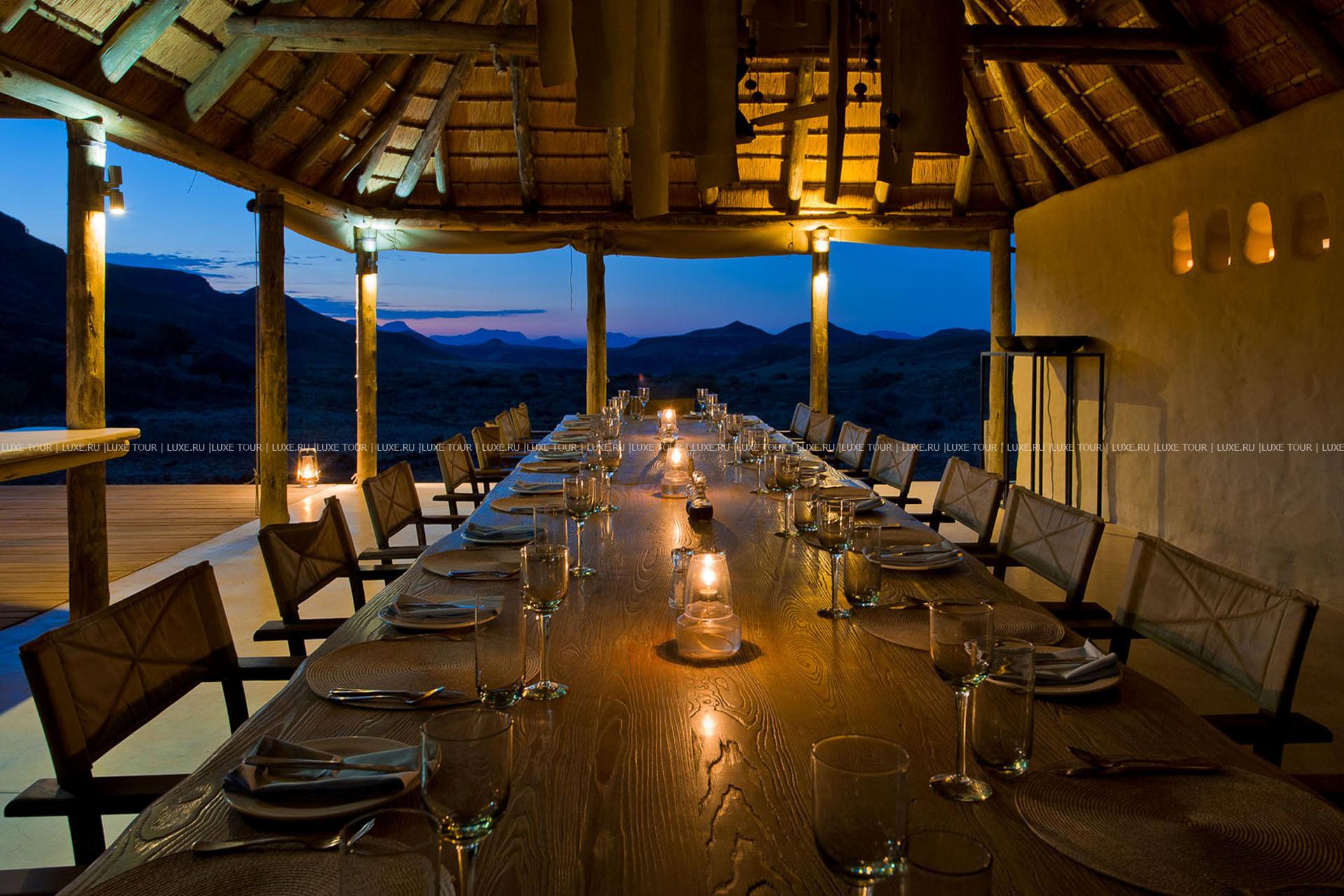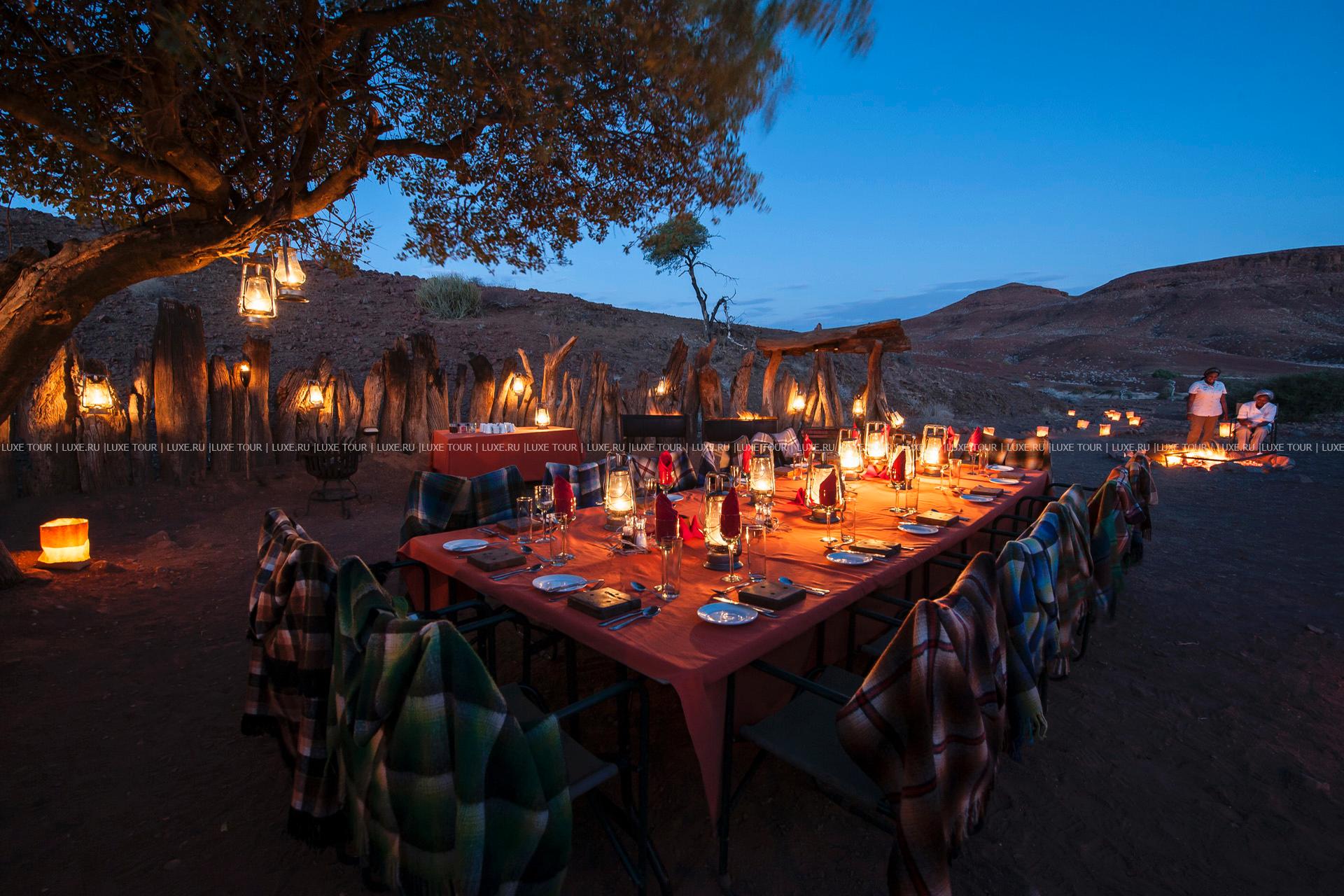 - Во время сафари и экскурсий организуются пикники на природе с коктейлями или винами и легкими закусками. Ужин из 3-х блюд, международная кухня и ассортимент местных намибийских блюд, превосходные марочные вина.