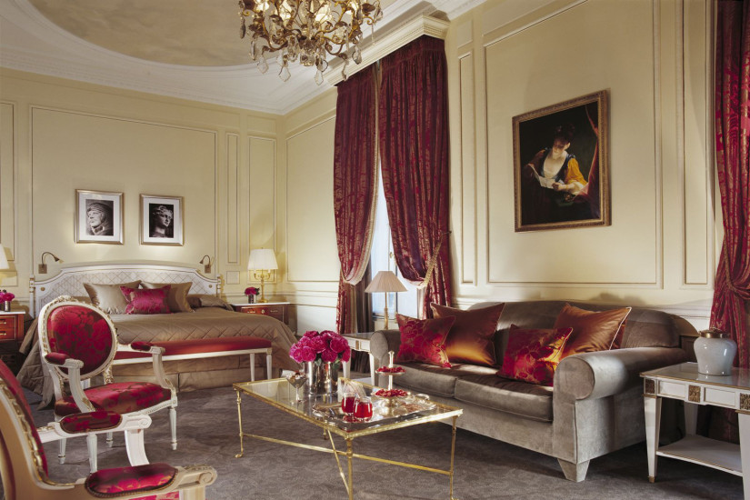 - 40 м2. Состоит из спальни с кроватью king-size или двумя кроватями twin, гостиной зоны, рабочей зоны, прихожей и просторной мраморной ванной комнаты с ванной и душевой. Номер оформлен в классическом французском стиле эпохи Людовика XVI с изящной мебелью и пышными тканями, имеет вид на внутренний двор или улицу.