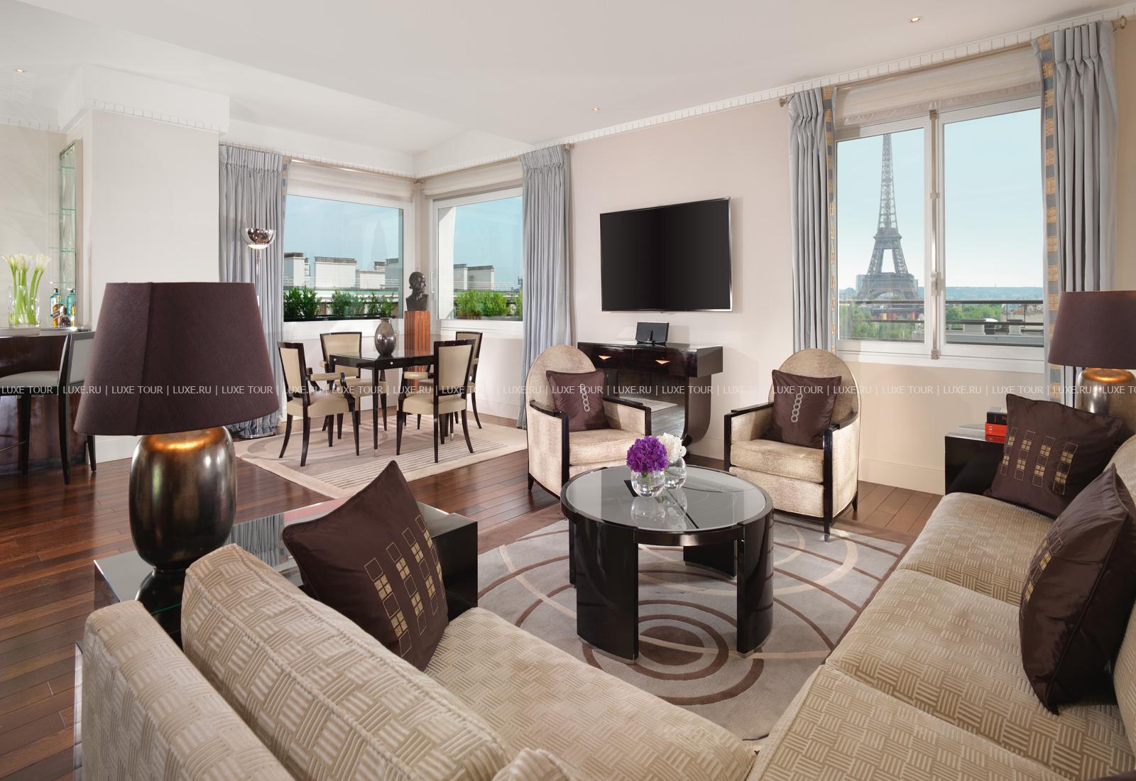 Недавно Plaza Athénée был полностью отреставрирован и сегодня предлагает своим клиентам два стиля номеров: шесть этажей отеля оформлены в классическом французском, украшенном антикварными лампами, резной мебелью и живописными полотнами, интерьеры двух верхних этажей — легкий изящный Ар Деко, созвучный модернистским тенденциям и гармонирующий с Эйфелевой башней.