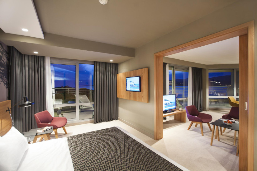 В Junior Suite и Suite имеется отдельная просторная терраса; место, где можно поужинать, место для отдыха, а также дополнительная ванная комната. В отеле располагается единственное в Хорватии крыло, предназначенное специально для VIP гостей. Здесь гостям предлагаются сьюты, в которых помимо удобств, имеющихся в стандартных номерах, есть отдельный вход, персональный выход к парковке, персональная терраса. VIP крыло – идеальный выбор для звезд, политиков и небольших групп важных гостей.