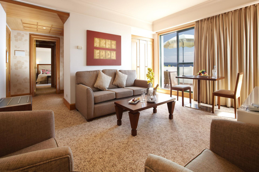 - 112 м2. Состоит из холла, спальни с двумя кроватями queen-size, гостиной с обеденной зоной, ванной комнаты с джакузи, отдельным душем и туалетной комнатой, гостевой ванной комнаты, гардеробной, балкона с панорамным видом на залив Фуншала. Максимальное размещение – 3 человека. Гостям номера предоставляются дополнительные услуги.