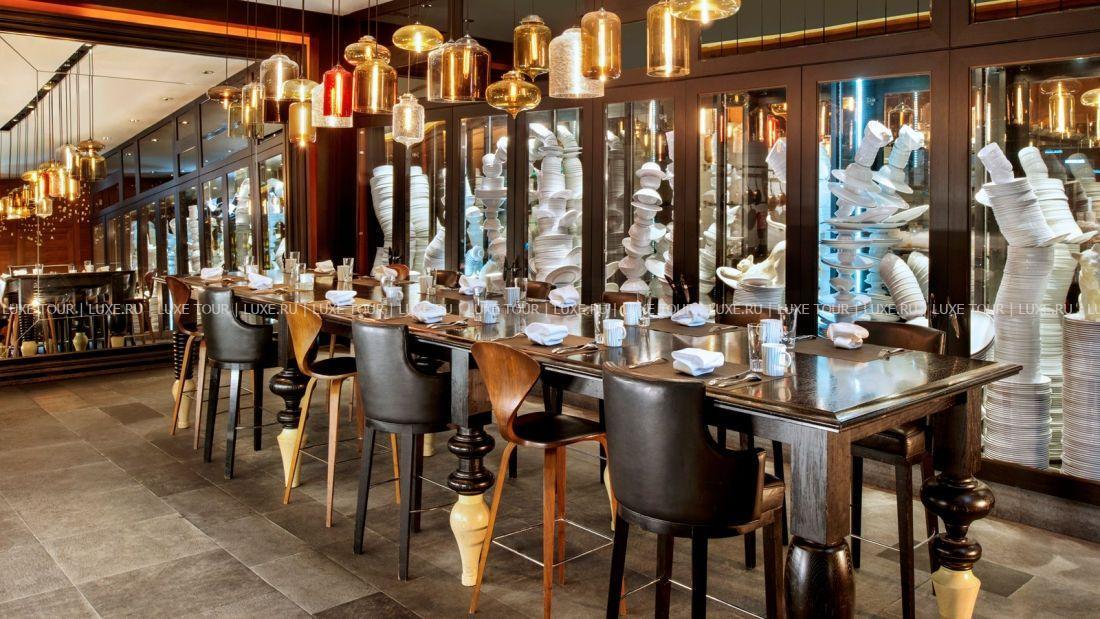 В элегантном ресторане Fire, выполненном в красных тонах, предлагаются деликатесы из мяса и морепродуктов.