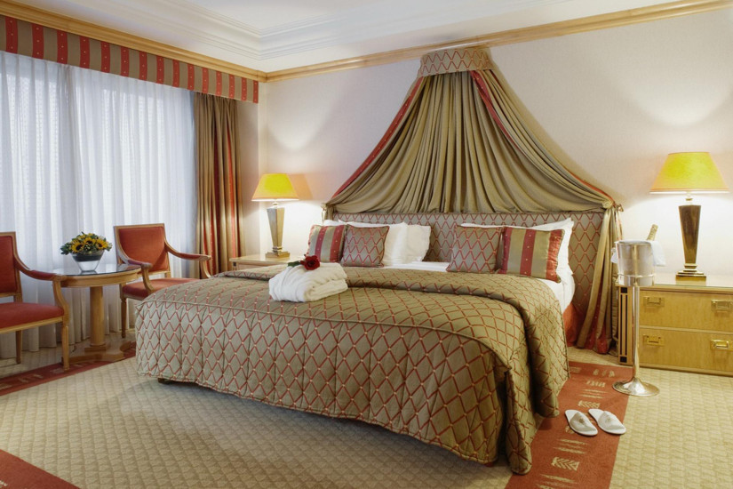 - 485 м2. Фешенебельный двухуровневый номер с панорамным видом на город состоит из двух спальных комнат, двух гостиных комнат, двух ванных, тренажерного зала, кинотеатра, столовой на 14 гостей, кухни. Обтянутые шелком стены, мраморные полы, великолепные ковры и мебель в шоколадных тонах создают неповторимую атмосферу роскоши. Роскошная люстра длиной 3,5 метра от Sharon Marston спускается каскадами со второго этажа к обеденному столу на первом этаже. Отполированные хромированные балки поддерживают ступеньки стеклянной лестницы, которая освещается светодиодами.