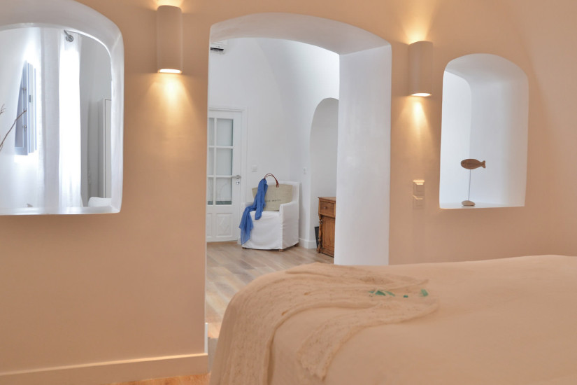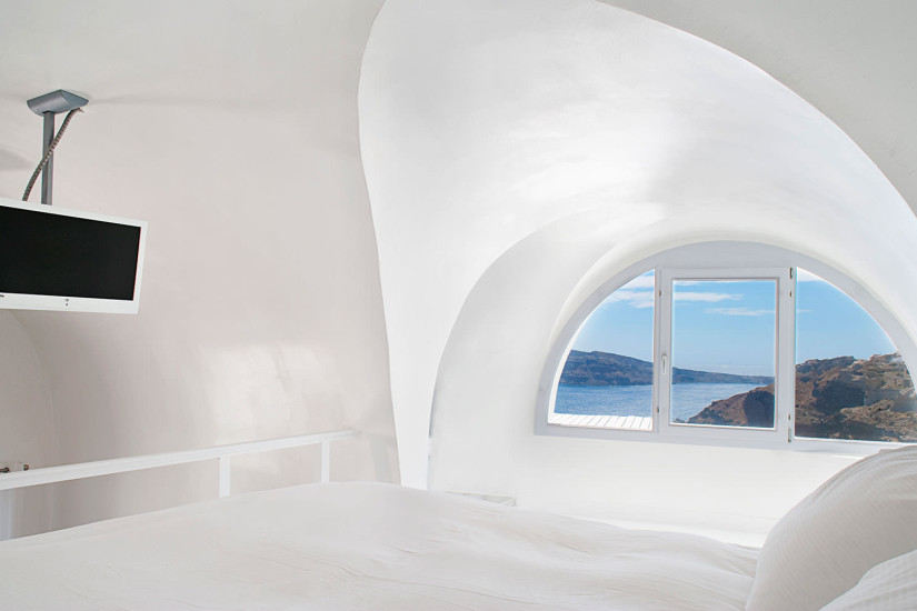 - 30 м2. Номер с видом на море и скалы оформлен в традиционном эгейском стиле. В декоре интерьера преобладает кипельно белый цвет с зеленовато-голубыми акцентами. Состоит из спальни, зоны отдыха, ванной комнаты с душем, террасы.
