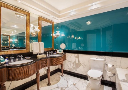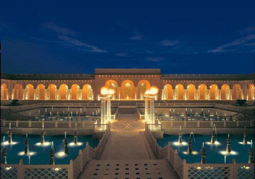Парадный вход в великолепное лобби отеля украшен 64 фонтанами, а открытый бассейн, освещаемый светильниками, окружен колоннадой из белого мрамора.