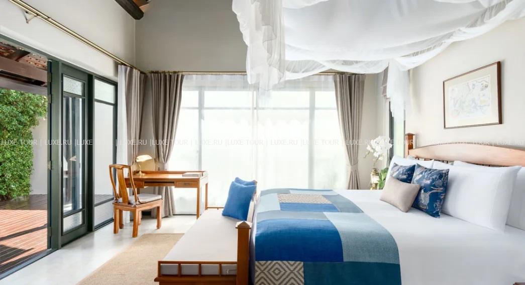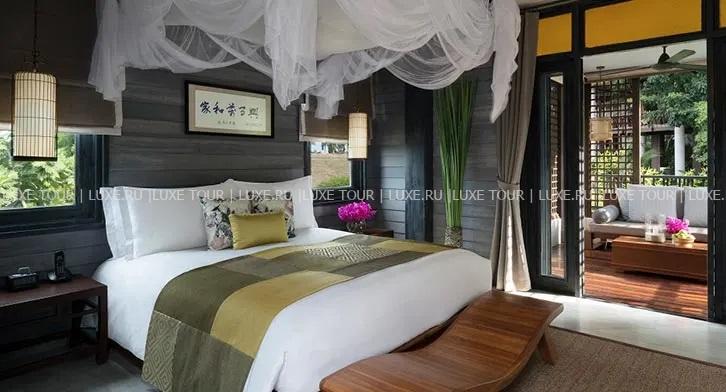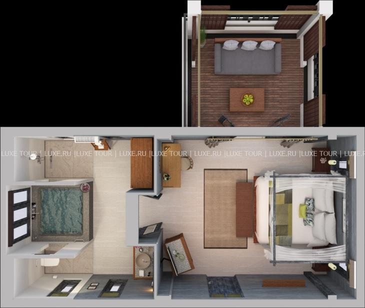 - 55 м2. Состоит из спальни с кроватью king-size или двумя кроватями twin, зоны отдыха, ванной комнаты, меблированного балкона с видом на сад. Максимальное размещение — 3 человека.