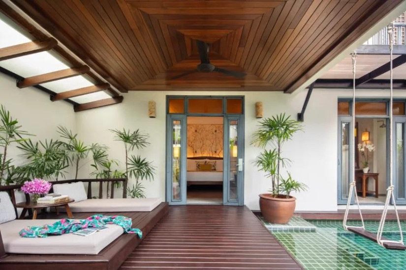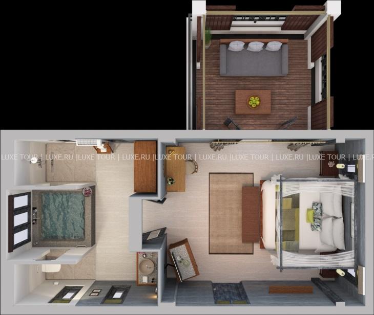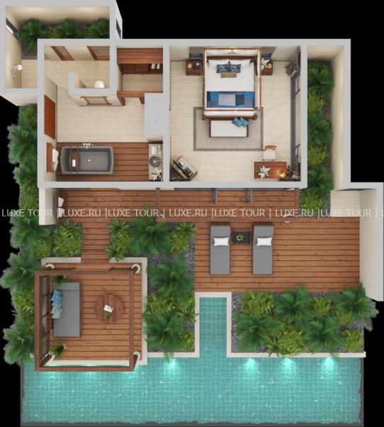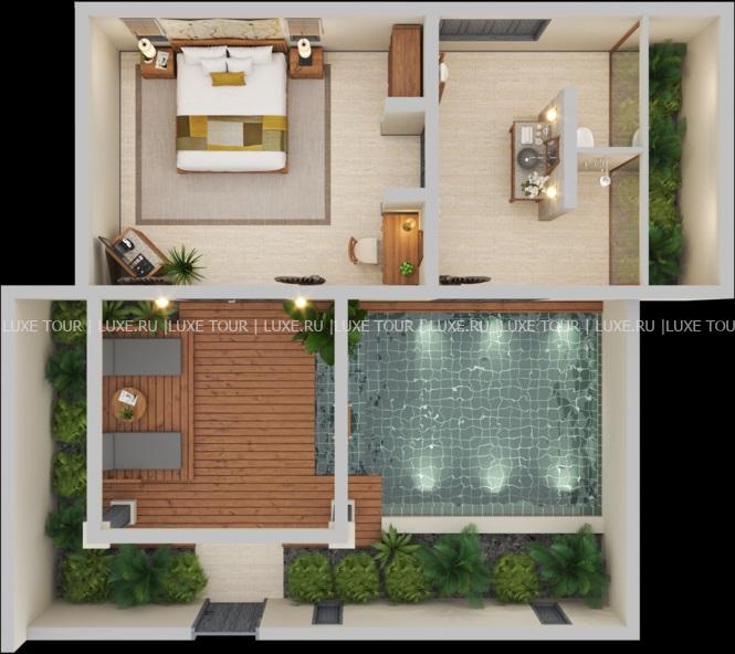 - 89 м2. Состоит из спальни с кроватью king-size, ванной комнаты, меблированной террасы с бассейном. Максимальное размещение — 3 человека.