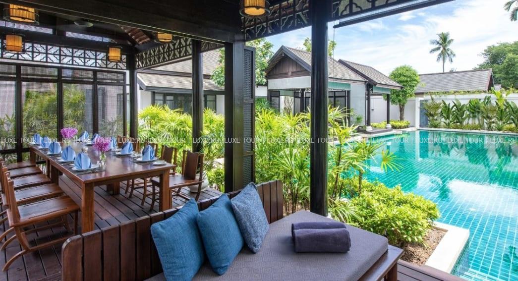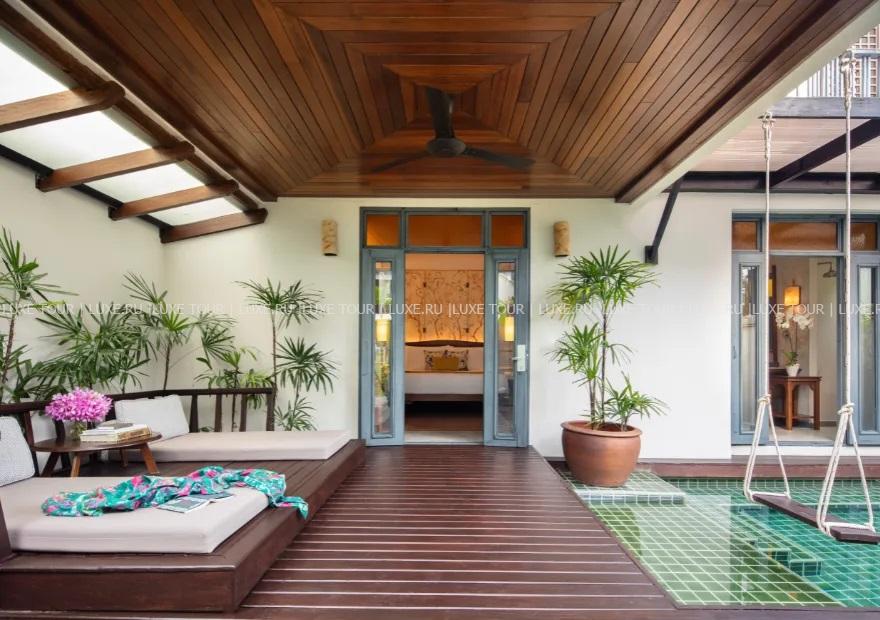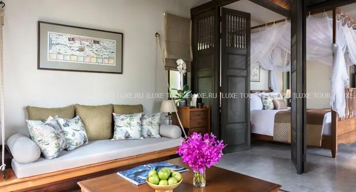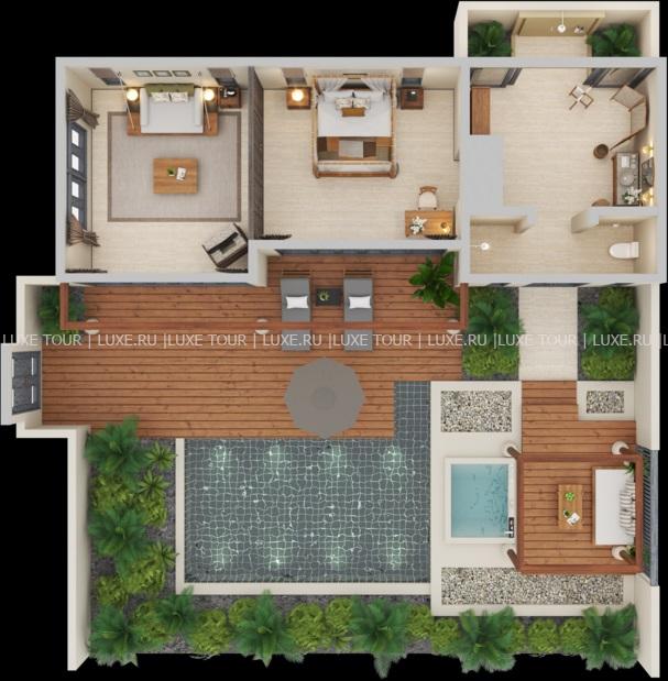 - 160 м2. Состоит из спальни с кроватью king-size или двумя кроватями twin, гостиной, ванной комнаты, меблированной террасы с бассейном, павильоном для отдыха и душа на открытом воздухе. Вид на сад. Максимальное размещение — 4 человека.