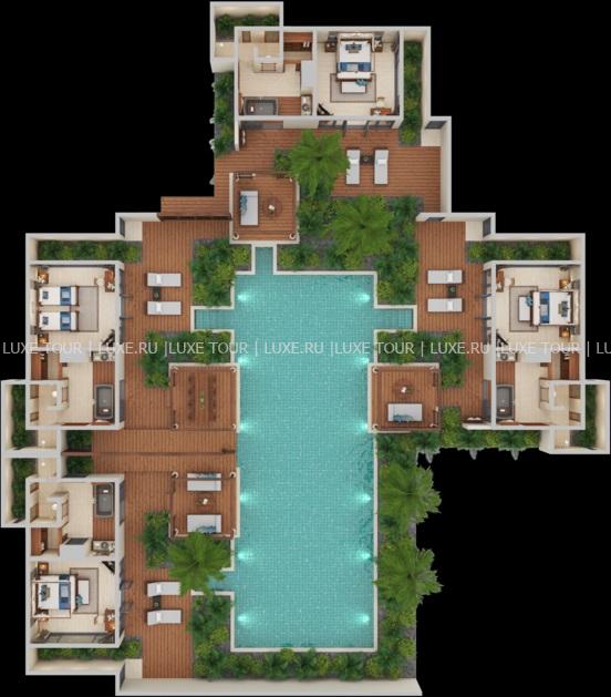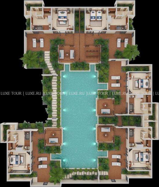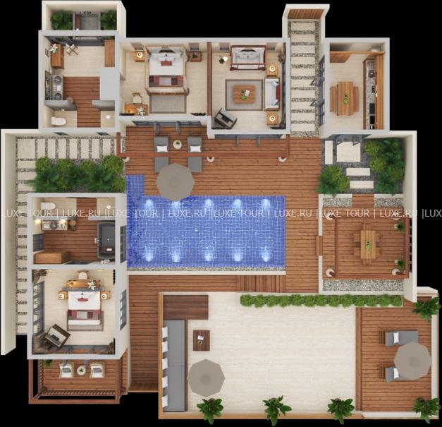 - 680 м2. Состоит из четырех спален с тремя кроватями king-size и двумя кроватями twin, обеденной зоны, ванных комнат, меблированной террасы с бассейном и павильоном для отдыха. Максимальное размещение — 12 человек.