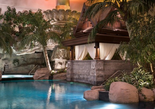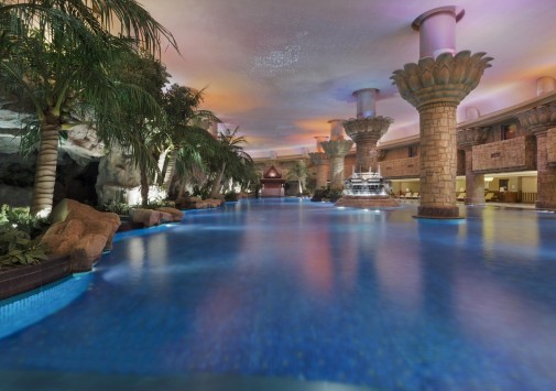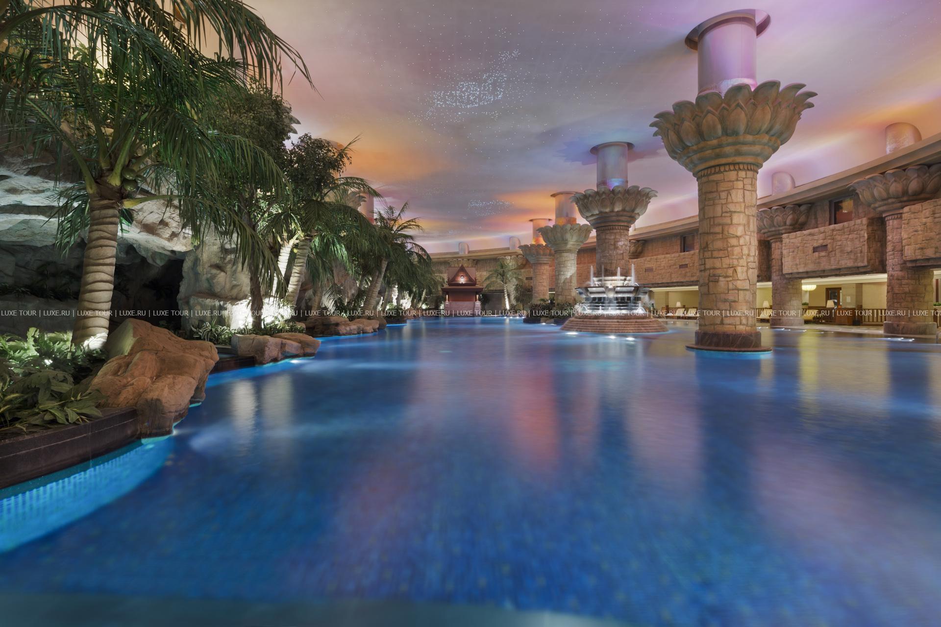 В отеле есть уникальный крытый 55 –метровый бассейн, площадью 1500 кв.м, выполненный в тропическом стиле: с пышными растениями, римскими колоннами, джакузи с подогревом, водопадами, террасой для отдыха.