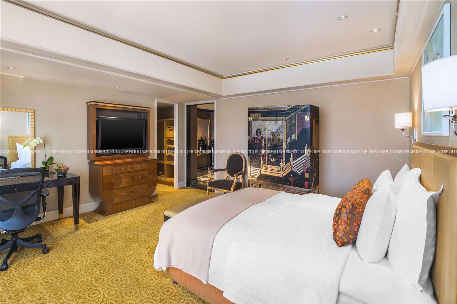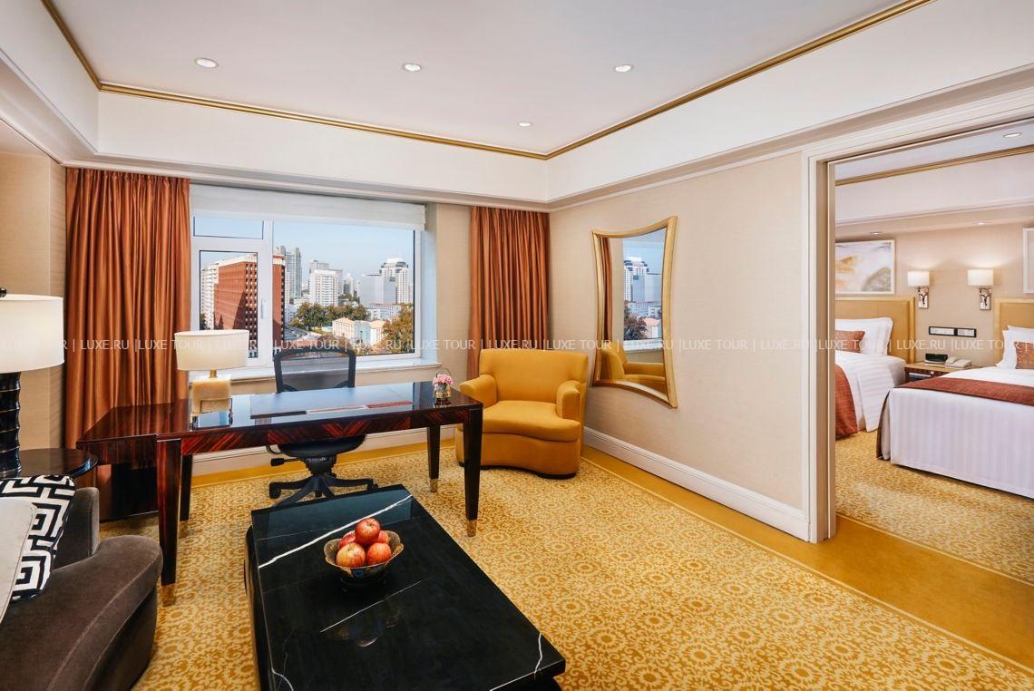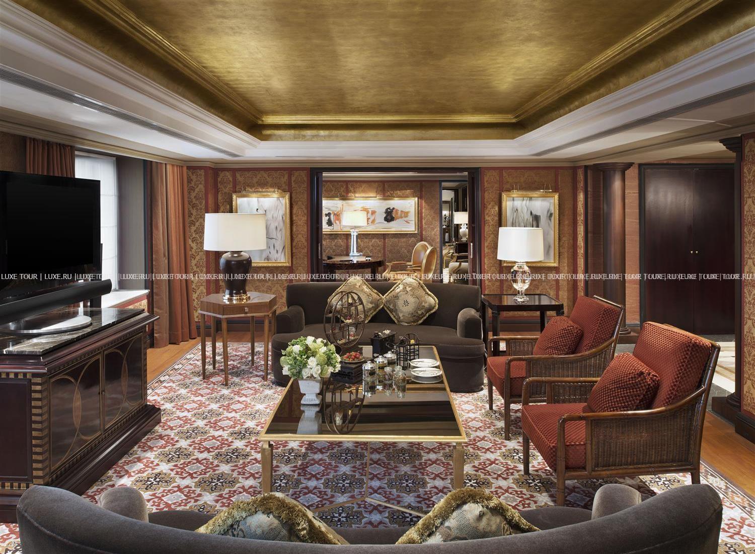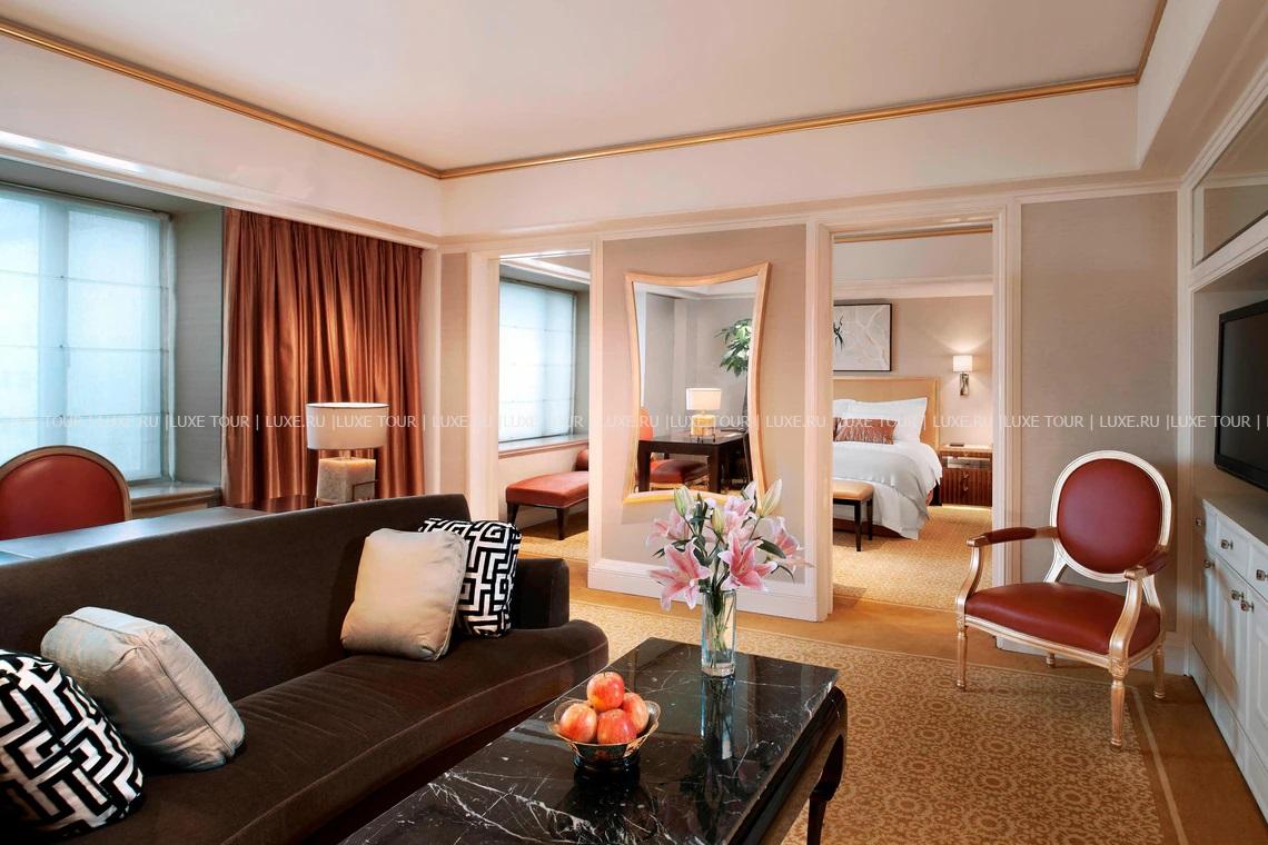 За стенами современной башни St. Regis, Beijing, расположенной в центральном деловом и торговом районе Пекина, рядом с Запретным Городом, площадью Tiananmen, шёлковым базаром и другими достопримечательностями китайской столицы, скрывается элегантность европейской классики и утонченное великолепие восточного стиля: отделка из мрамора и благородного дерева, широкие лестницы и величественные колонны, фонтаны и ниши, лепнина и хрустальные люстры, пышные декоративные растения и произведения искусства. В номерах, оборудованных по последнему слову техники, — изысканные интерьеры в золотистых тонах, сочетающие классический стиль и китайские мотивы, с изящной мебелью, дорогими коврами, тщательно подобранными элементами декора.