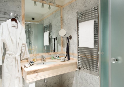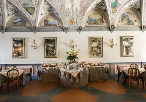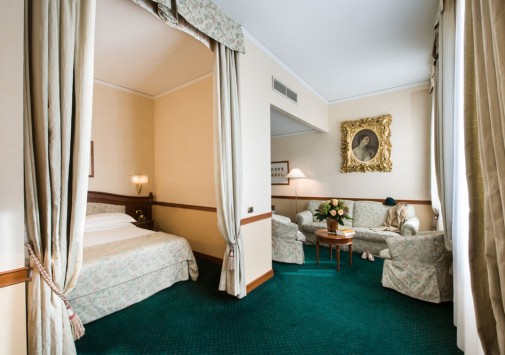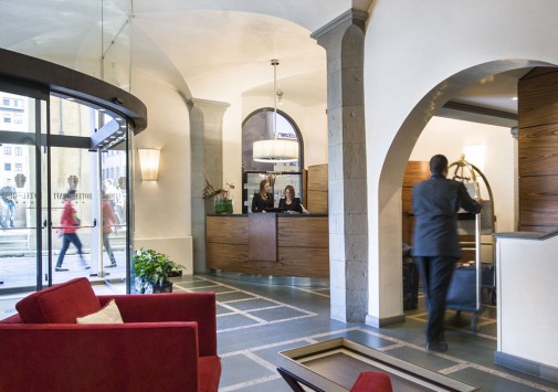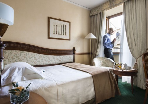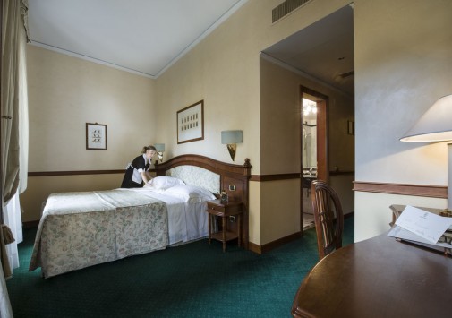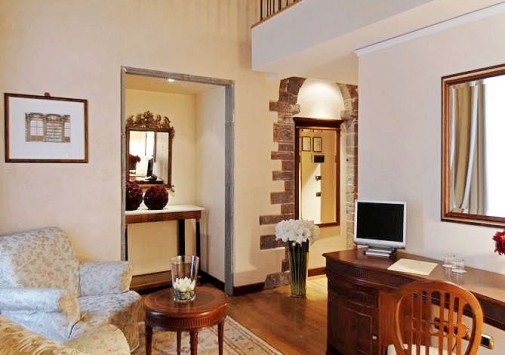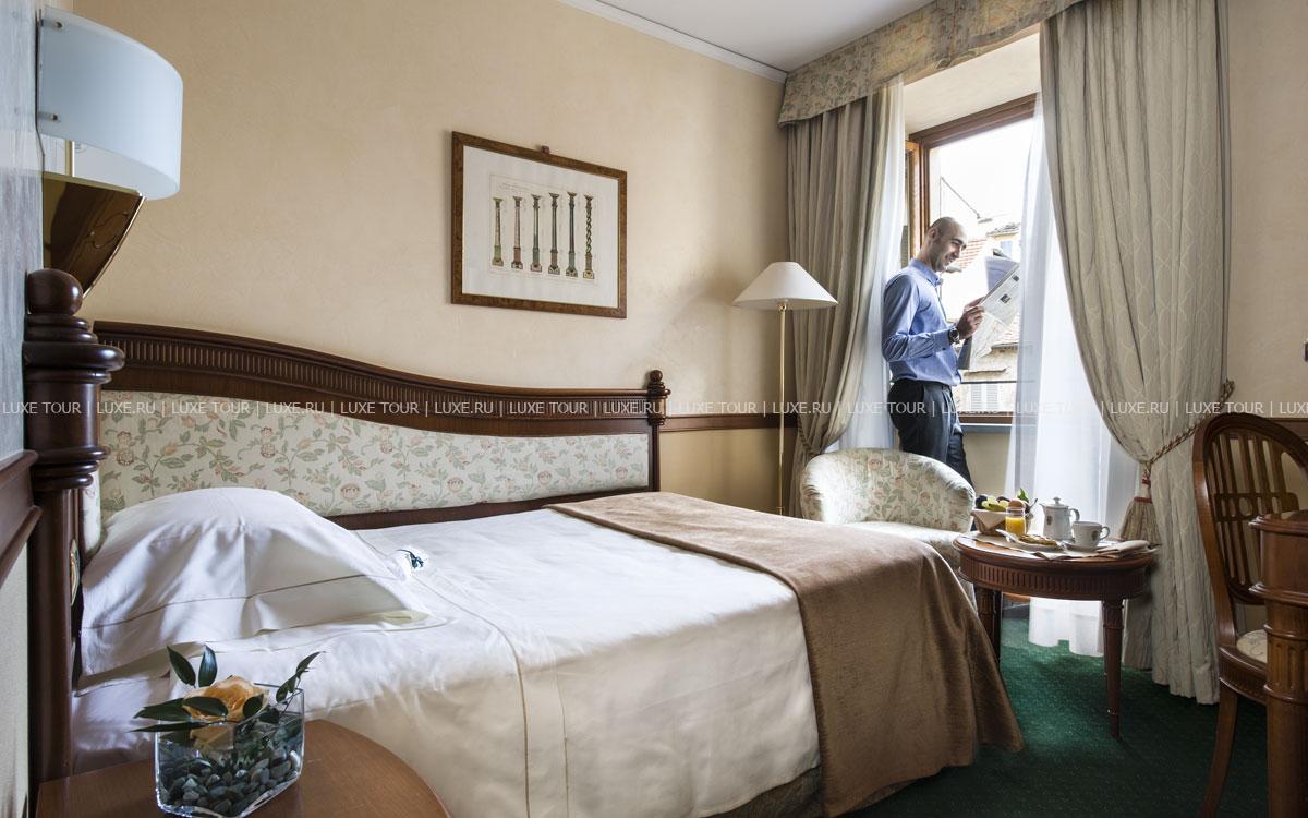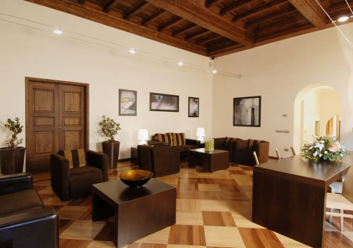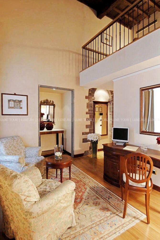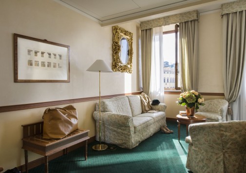 Здание гостиницы идеально вписано в общий стиль исторического центра и составляет важную его часть: скромный фасад с его воздушными арками, элегантными балконами и торжественным подъездом соотносится с элегантным полным необъяснимого шарма убранством номеров. Интерьеры холлов и номеров украшены предметами искусства, антикварными вещицами и всевозможными мелочами, играющими важную роль в создании неповторимой атмосферы помещений: роскошные зеркала, гербовые знаки, расписные потолки, грациозные люстры, живописные ковры, старинные книжные шкафы, оригинальные вазы и многое другое. К услугам гостей отеля гостиная, где предлагаются завтраки, и American Bar, где сервируют разнообразные закуски и напитки.