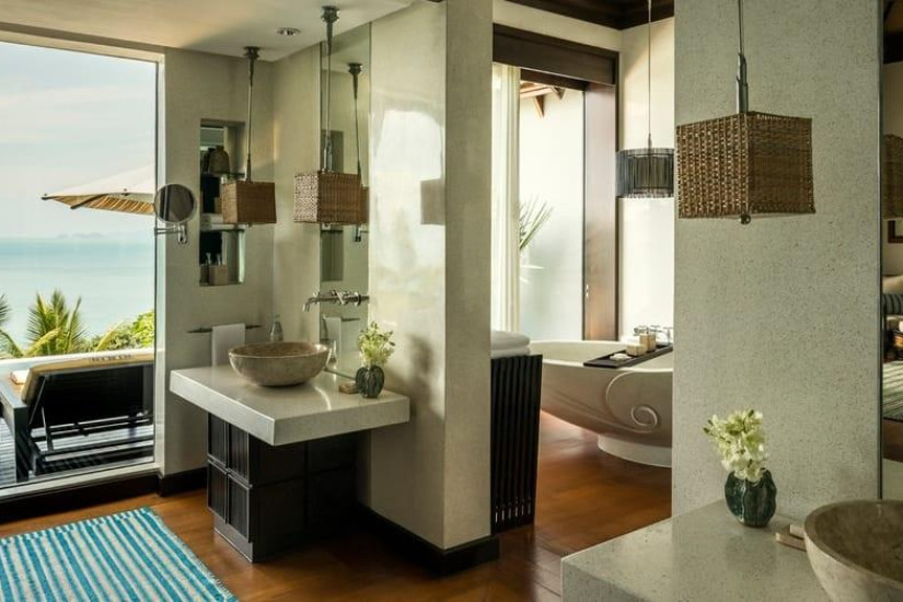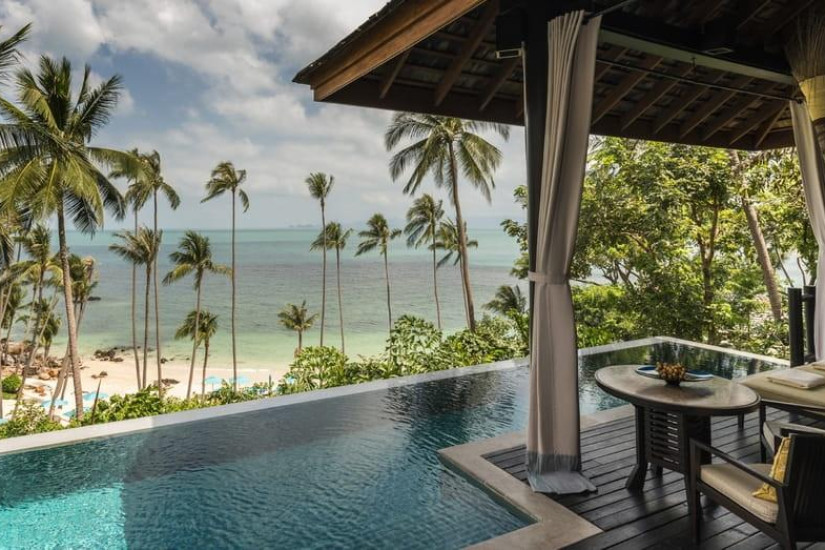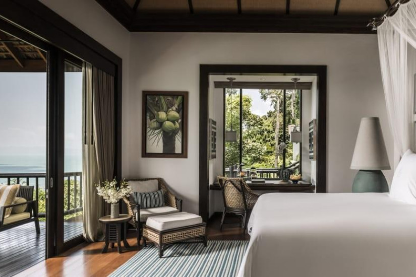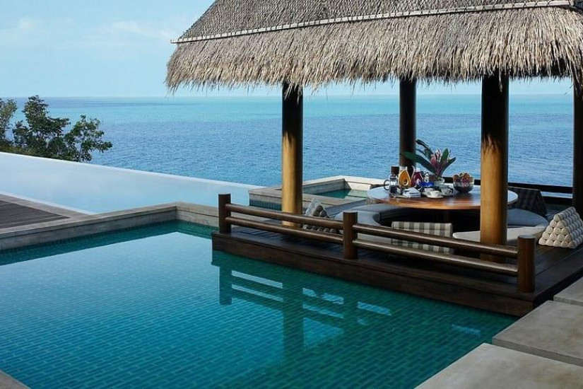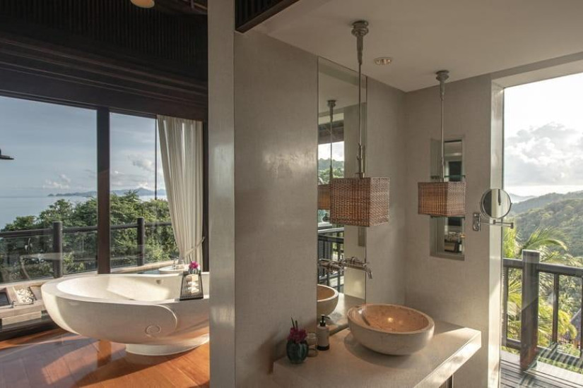 - 752 м2. Состоит из двух спален с кроватью king-size и двумя кроватями twin, гостиной с обеденной зоной, двух ванных комнат, туалетной комнаты, мебелированной террасы, бассейна. Вид на Сиамский залив и остров Пханган. Максимальное размещение — 6 взрослых или 4 взрослых + 2 ребенка.