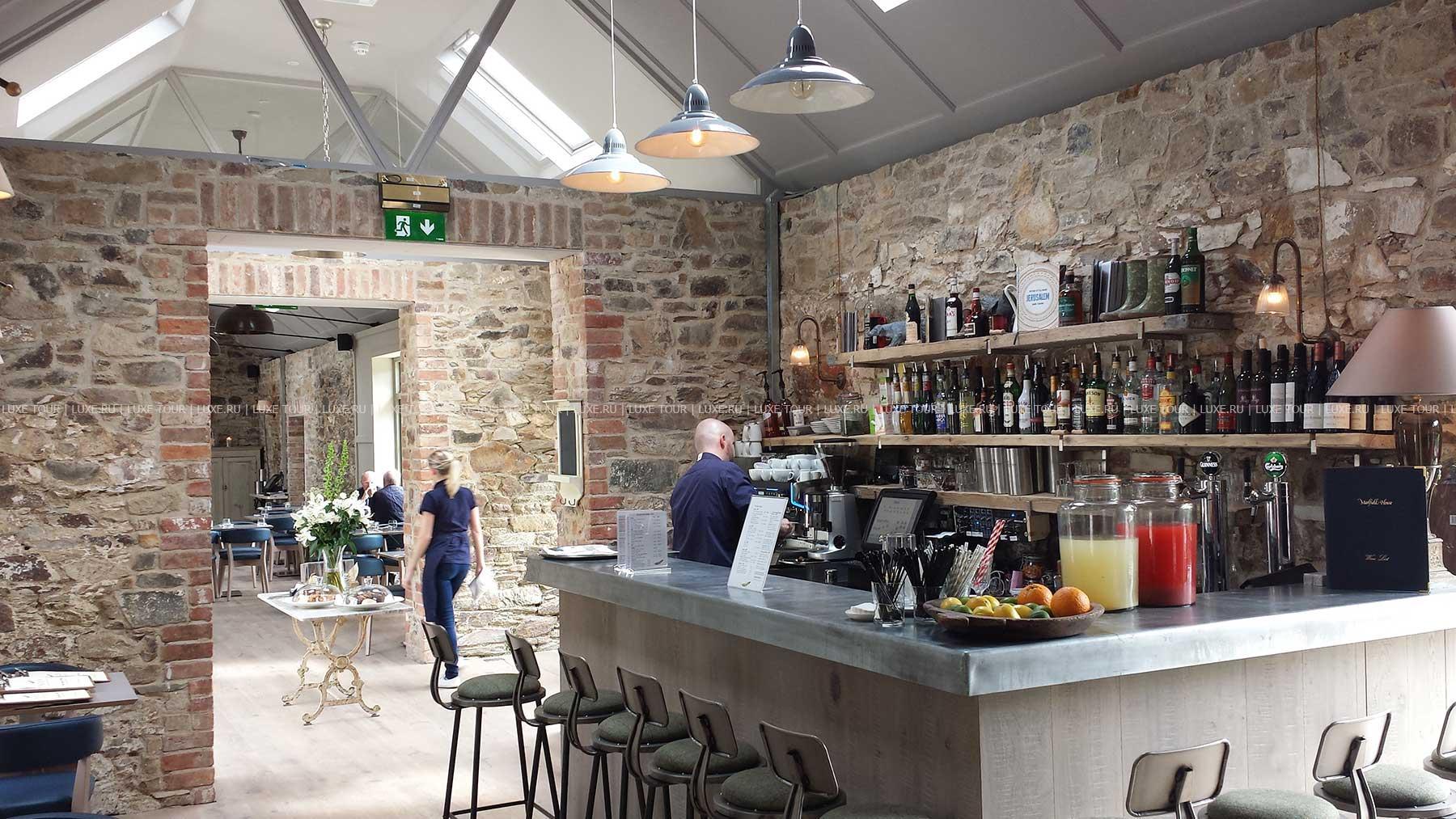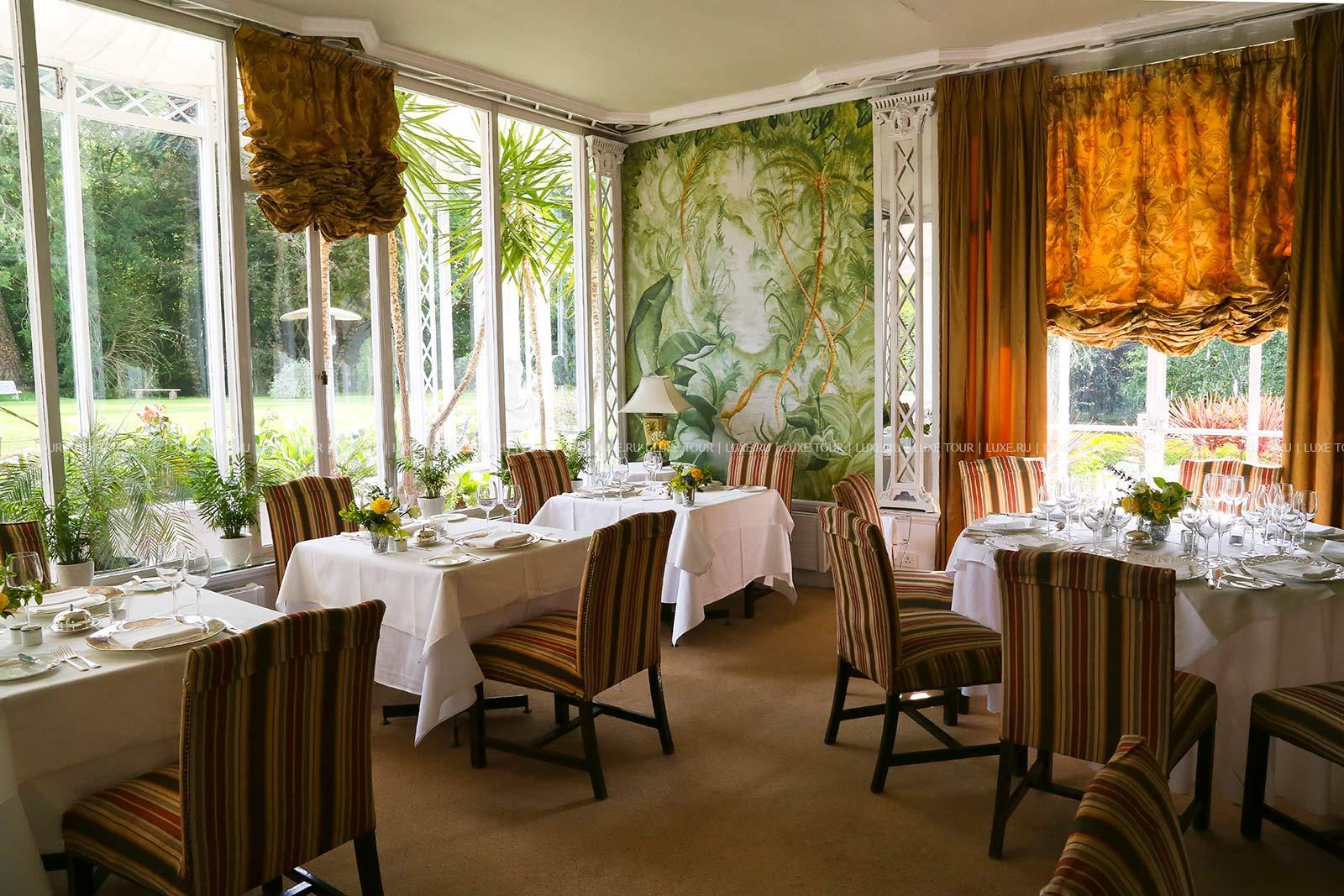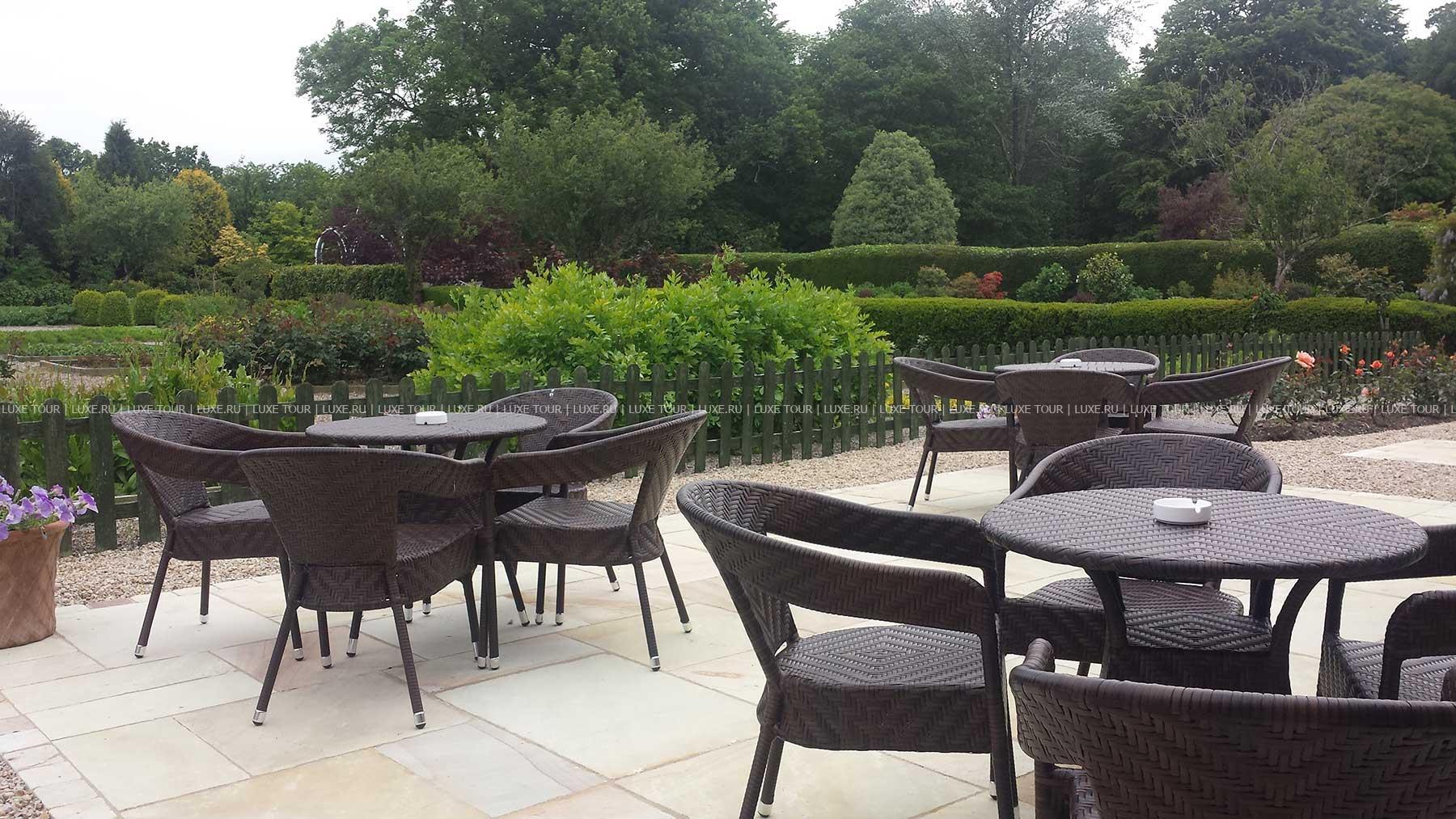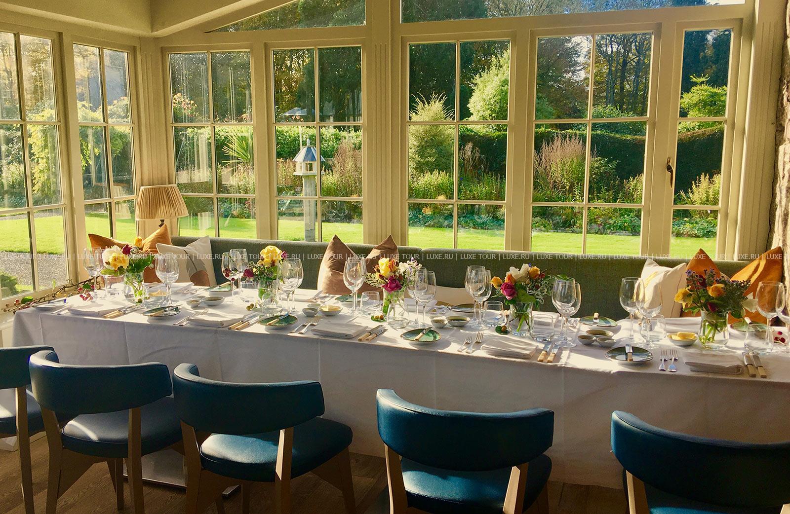 Утренний кофе, послеобеденный чай подаются в обеденном зале, оранжерее и в саду, ланчи также подаются в библиотеке.
