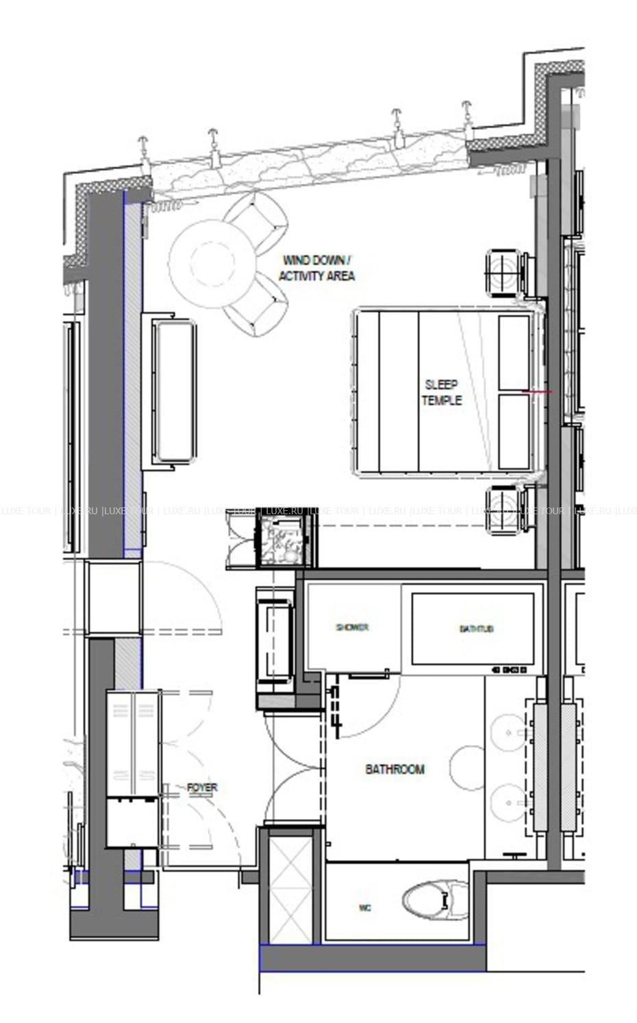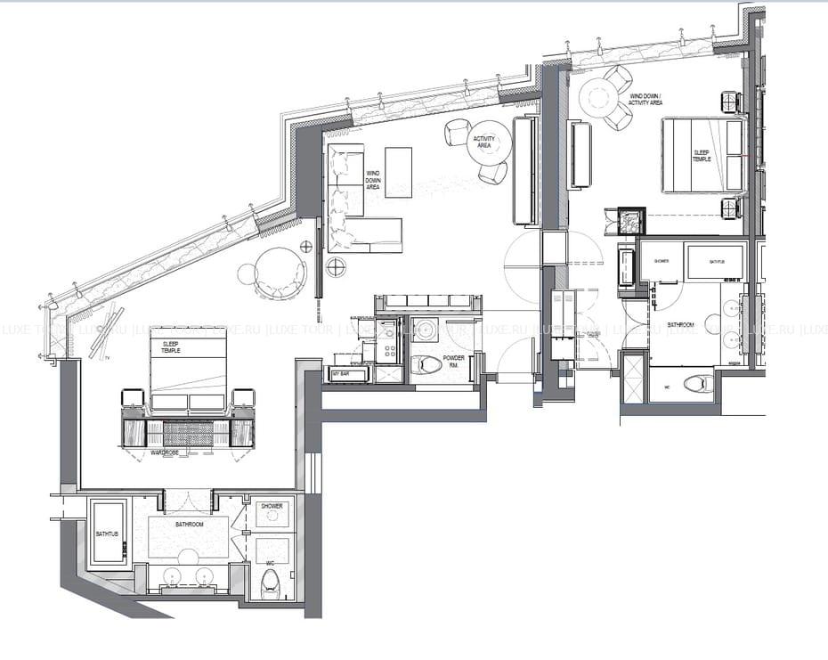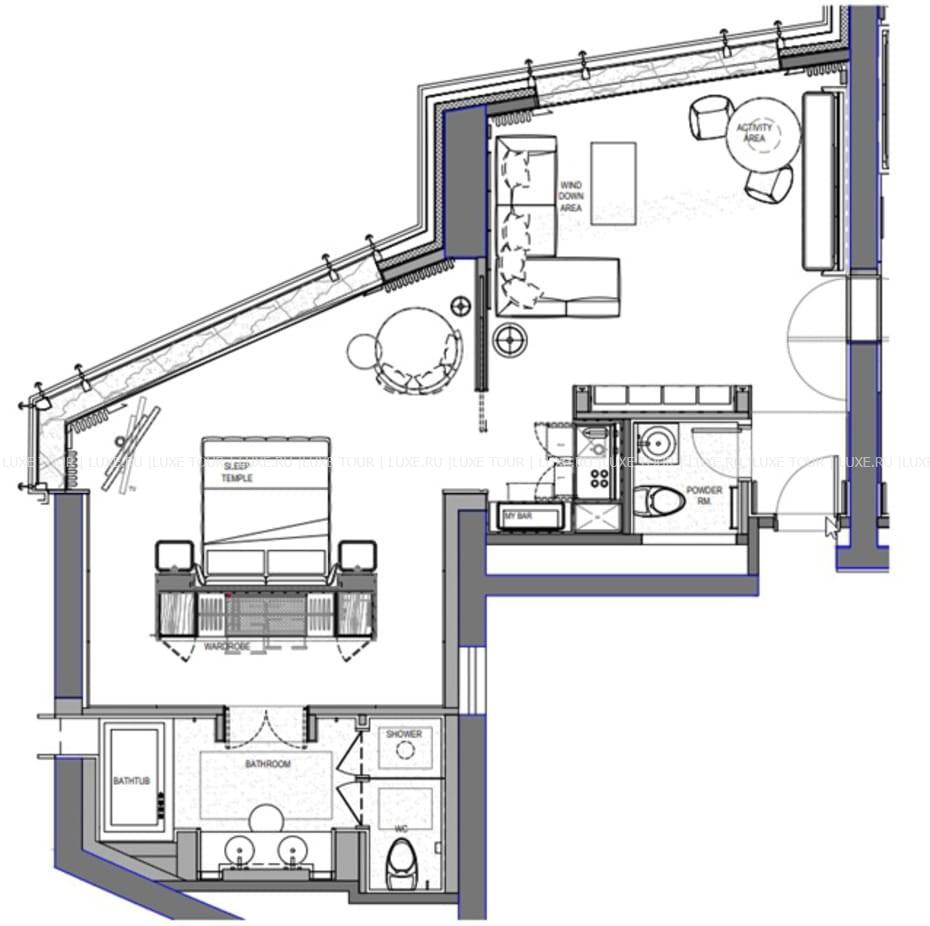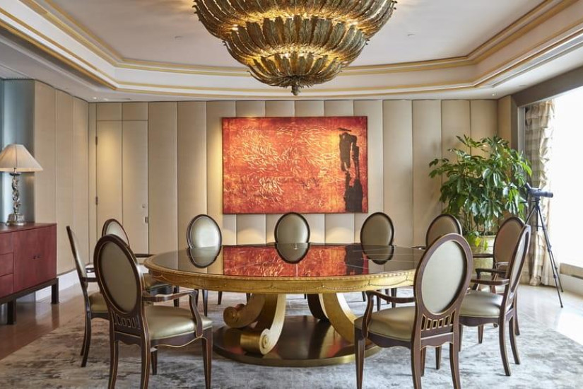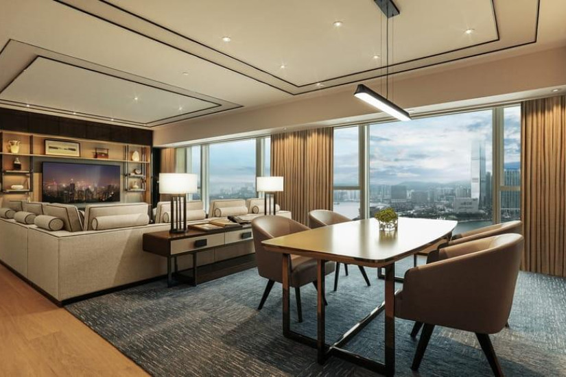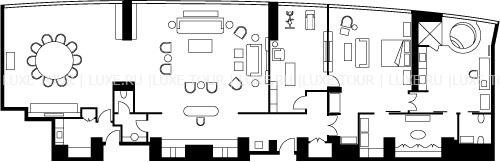 - 319 м2. Состоит из спальни с кроватью king-size, гостиной, обеденной зоны, фитнес-комнаты, ванной комнаты, гостевой туалетной комнаты. Вид на бухту Виктория и полуостров Коулун. Номера располагаются на 43 этаже. Доступ в представительский клуб. Максимальное размещение – 3 человека.