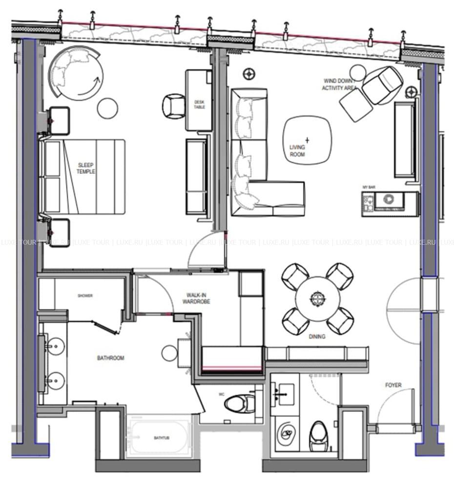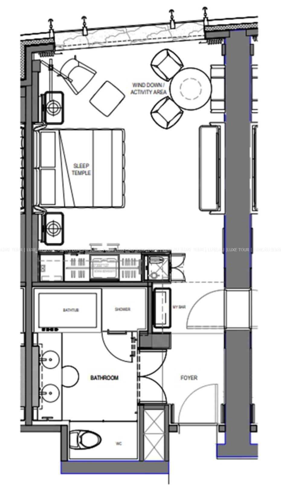 - 45 м2. Состоит из спальни с кроватью king-size или двумя кроватями twin, зоны отдыха, ванной комнаты. Вид на город. Номера располагаются с 9 по 35 этаж. Максимальное размещение – 3 человека.