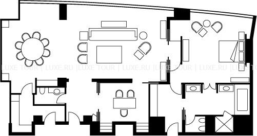 - 228 м2. Состоит из спальни с кроватью king-size, гостиной с обеденной зоной, ванной комнаты. Вид на бухту Виктория и полуостров Коулун. Номера располагаются на 42 этаже. Максимальное размещение – 3 человека.