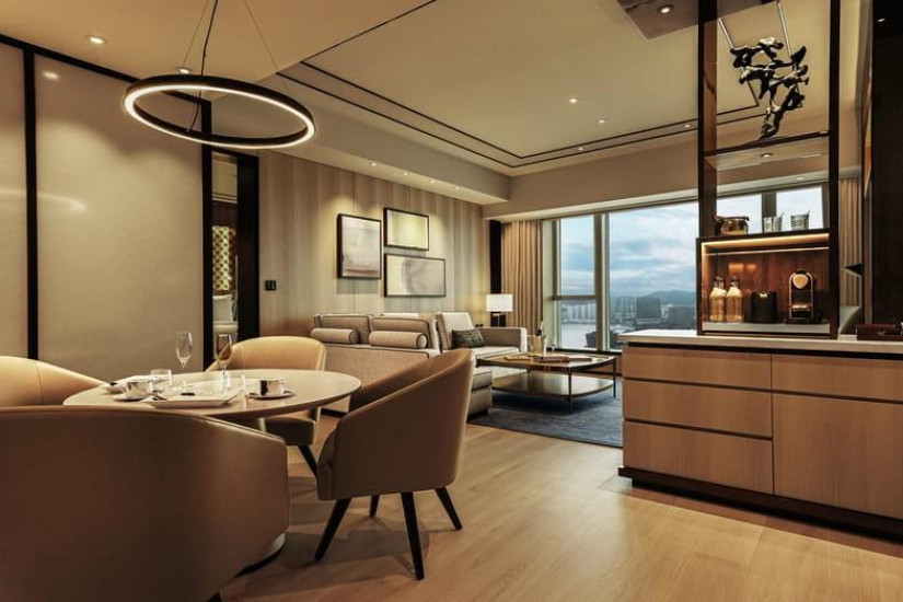 - 91 м2. Состоит из спальни с кроватью king-size или двумя кроватями twin, гостиной, обеденной зоны, ванной комнаты. Вид на бухту Виктория и полуостров Коулун. Номера располагаются с 25 по 41 этаж. Доступ в представительский клуб. Максимальное размещение – 3 человека.